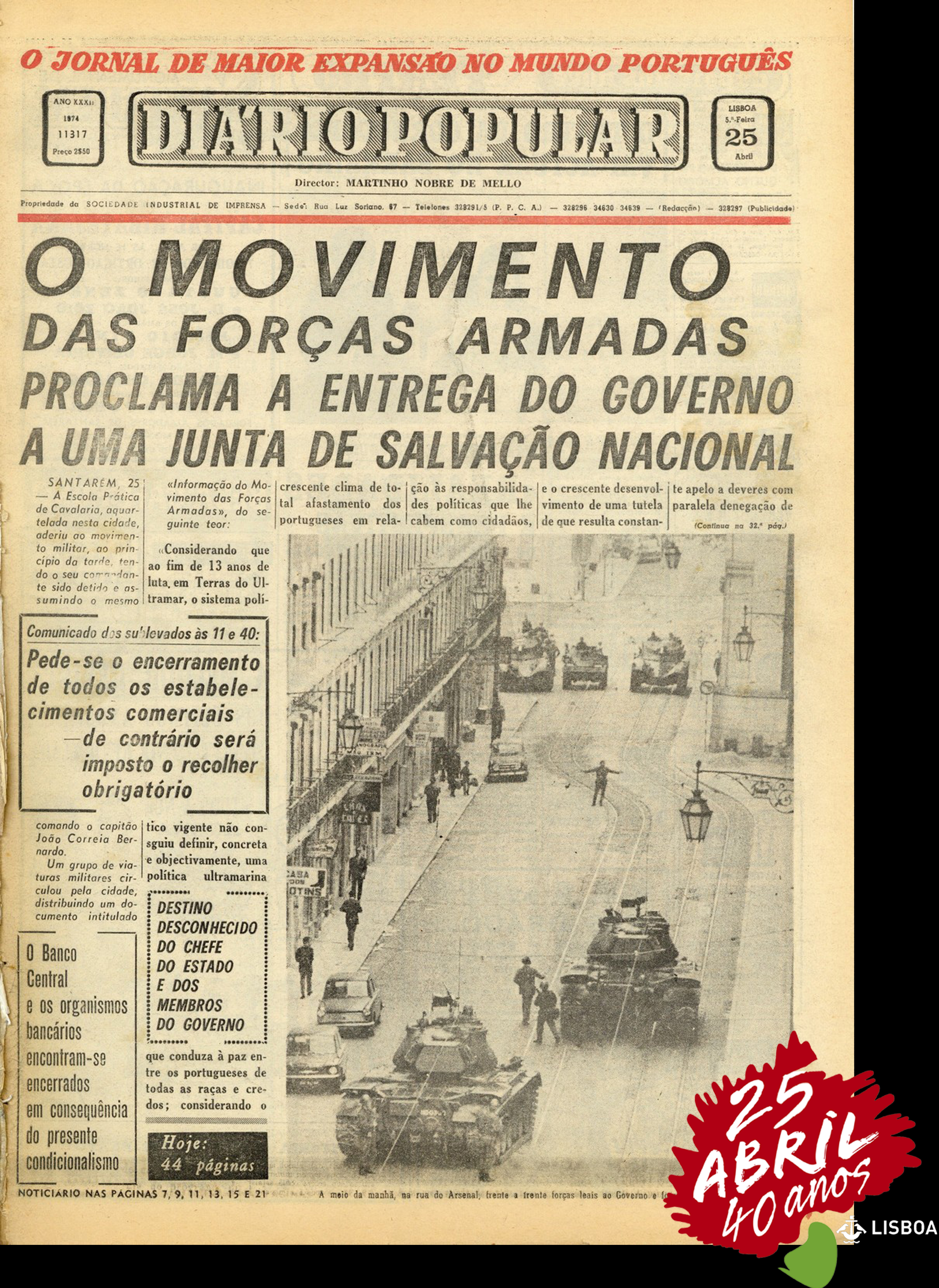contrafeito das primeiras notícias da edição de 25 de abril.