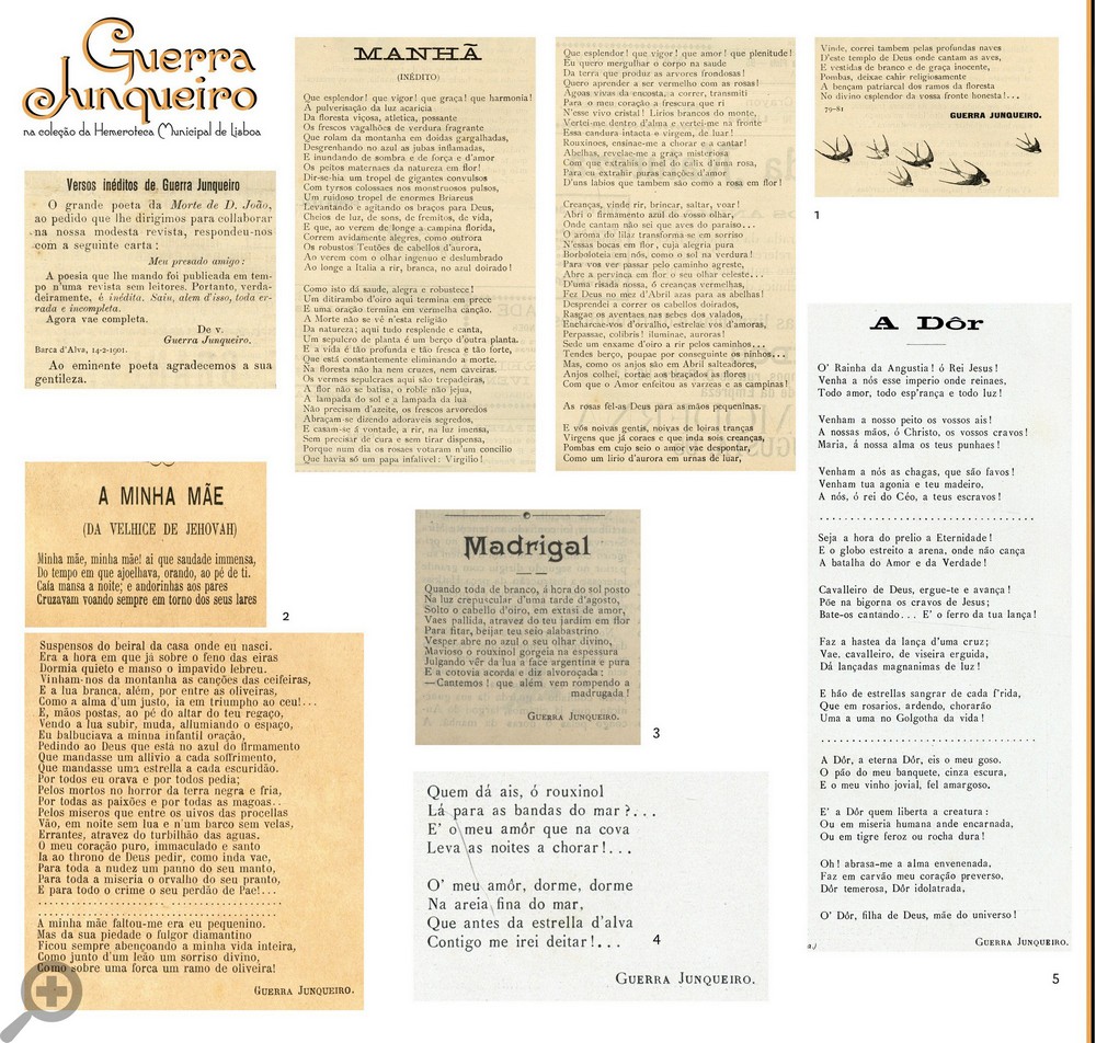 1.”Manhã” A Chronica N.º 36, Mar. 1901, p. 3 ver aqui 2.“A Minha Mãe” A Illustração Portugueza N.º 2, 27 Jul. 1885, p. 6 ver aqui 3.“Madrigal” Azulejos N.º 23, 24 Fev. 1908, p. 6 ver aqui 4.[Quem dá ais...] Brasil-Portugal N.º 329, 1 Out. 1912, p. 651 ver aqui 5.“A Dôr” Brasil-Portugal N.º 324, 16 Jul. 1912, p. 562 ver aqui | |||||