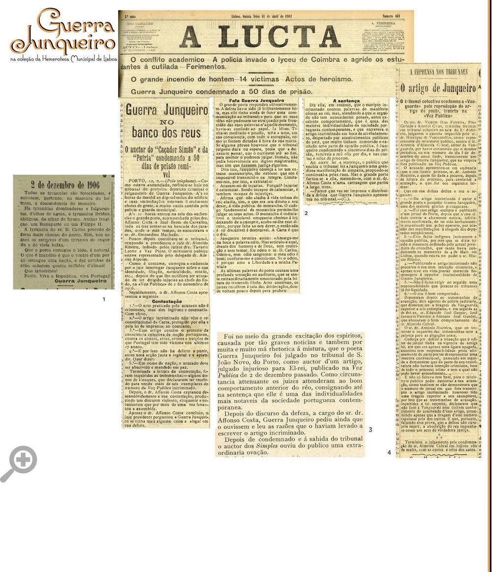 Vanguarda 3 Dez. 1906, p. 1 ver aqui 2. ”Guerra Junqueiro no banco dos réus” A Lucta 11 Abr. 1907, p. 1 ver aqui 3. “Chronica Occidental” João da Câmara Occidente N.º 1019, 20 Abr. 1907, p. 81-82 ver aqui 4. ”A Imprensa nos tribunais: o artigo de Junqueiro” A Lucta 16 Mai. 1907, p. 1 ver aqui | |||||