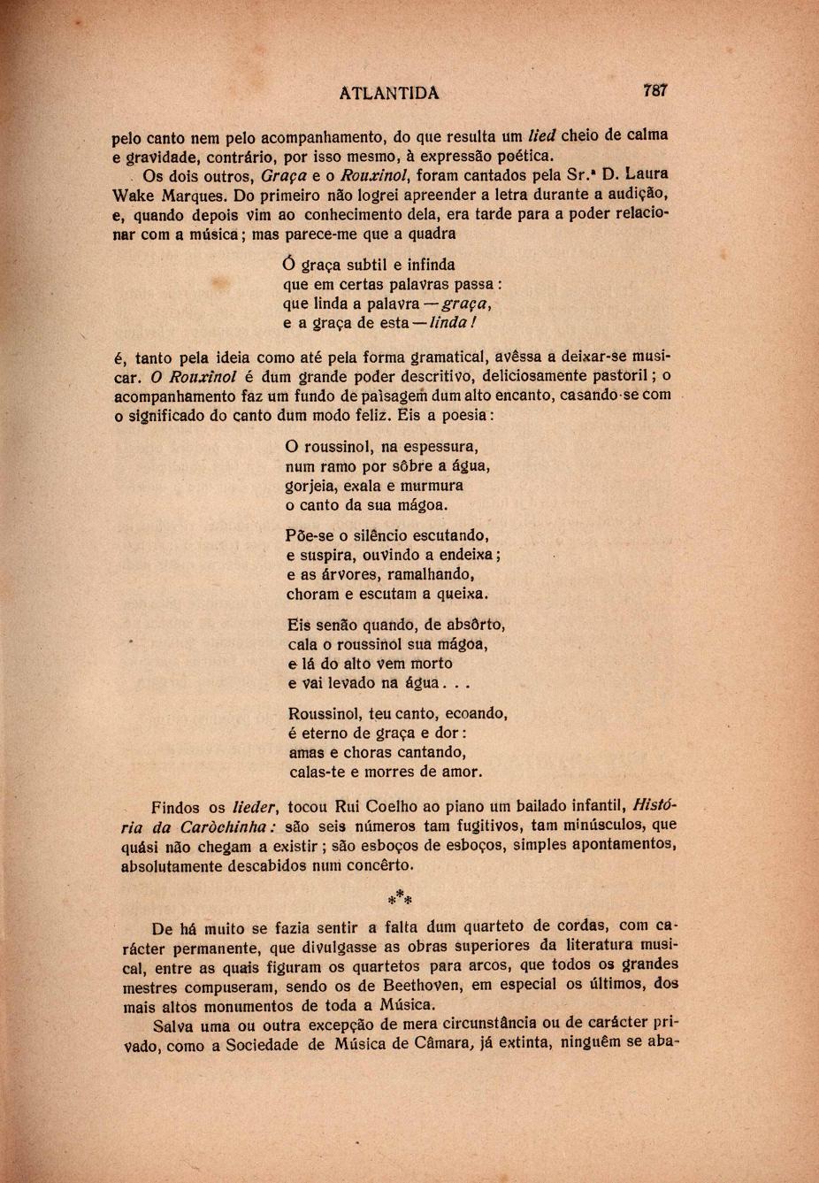 N.º 21, 15 Jul. 1917Portugal et France, por Philéas Lebesgue O autor oculto do "Crisfal", por Patrocínio Ribeiro Sonetos humildes, por Costa Santos A ama do Rei Dom Manuel, por Santos Farinha Mare Nostrum, por António Patrício Uma instituição que nos afirma: a Escola-Oficina n.º 1, em Lisboa, por Luís Cardim Museus de mobiliário, por Guedes de Oliveira O carreiro, por Seves d'Oliveira O inquérito da "Atlântida" : Confederação Luso-Brasileira, por Henrique Lopes de Mendonça Contos a uma rapariga loira, por Júlio Dantas Revista do mêsO mês literário, por Joaquim Manso e Júlio Brandão Crónica musical, por Humberto de Avelar O mês artistico, por Aqulino RibeiroExposição António Ramalho Debate artístico nos Paços do Concelho, por Aquilino Ribeiro Philéas Lebesgue ; António Feijó ; Abel Botelho Revista das revistas. Comunicados e notícias da Comissão de Hospitalização da Cruzada das Mulheres Portuguesas Suplemento ao n.º 21 da AtlântidaPortugal na Guerra : Uma cruzada bemdita, por M. S. | N.º 21, 15 Jul. 1917 > Revista do mês > Crónica musical, por Humberto de Avelar > 0787 Tipo:image/jpeg Tamanho:231 KB |
