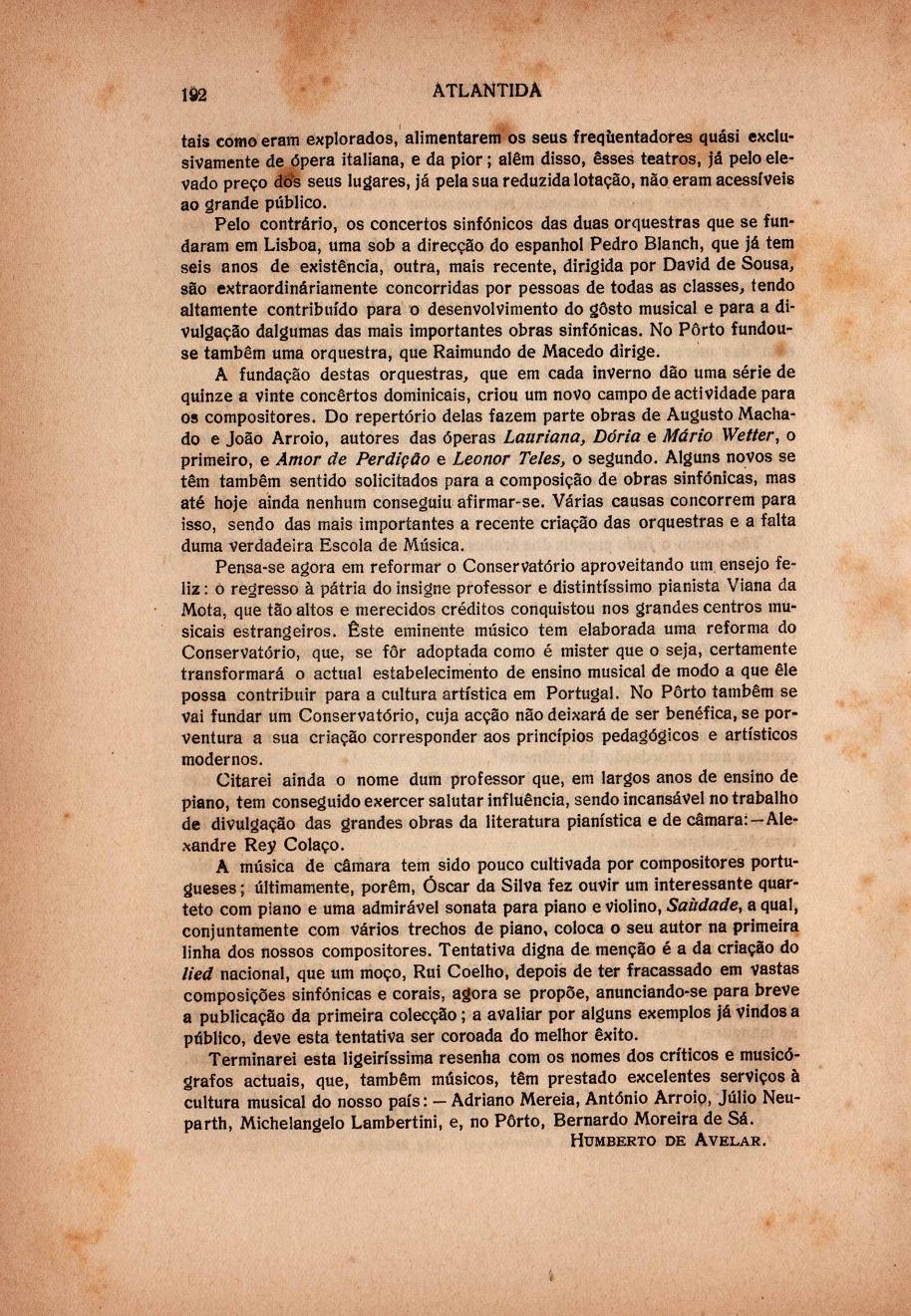 Atlântida : mensário artístico, literário e social para Portugal e Brasil N.º 25, 15 Nov. 1917 Capa sumário rosto verso Dr. Bernardido Machado : actual presidente da República Portuguesa C'est le peuple portugais qui fait son armée : paroles de Mr. le Ministre de la Guerra A marinha de guerra portuguesa e a Alemanha : entrevista com o Sr. Leote do Rego, comandante da divisão naval La marine de guerre portugaise et l'Allemagne : entrevue avec M. Leote do Rego, commandant de la division navale Augusto Soares : ministro dos Negócios Estrangeiros A Instrução Pública em Portugal L'instruction publique en Portugal Portugal heróico, por Henrique Lopes Mendonça Le Portugal heroïque, por Henrique Lopes de Mendonça Vindimando=La vendange, desenho de Roque Gameiro Dr. Manuel de Arriaga : Primeiro Presidente da República Portuguesa Les lettres au Portugal, par Manuel de Sousa Pinto Dr. Teófilo Braga : segundo Presidente da República Portuguesa, por Columbano O exército português na grande guerra : Primeiro encontro=La première rencontre, desenho de Alberto de Sousa A mulher portuguesa, por Amália de Queirós A caricatura portuguesa e a guerra = La caricature portugaise et la guerre, desenho de Manuel Gustavo Onde devemos passar as noites? : a temporada de inverno nos teatros de Lisboa publicidade contracapa | N.º 25, 15 Nov. 1917 > A música em Portugal, por Humberto de Avelar > 0192 |