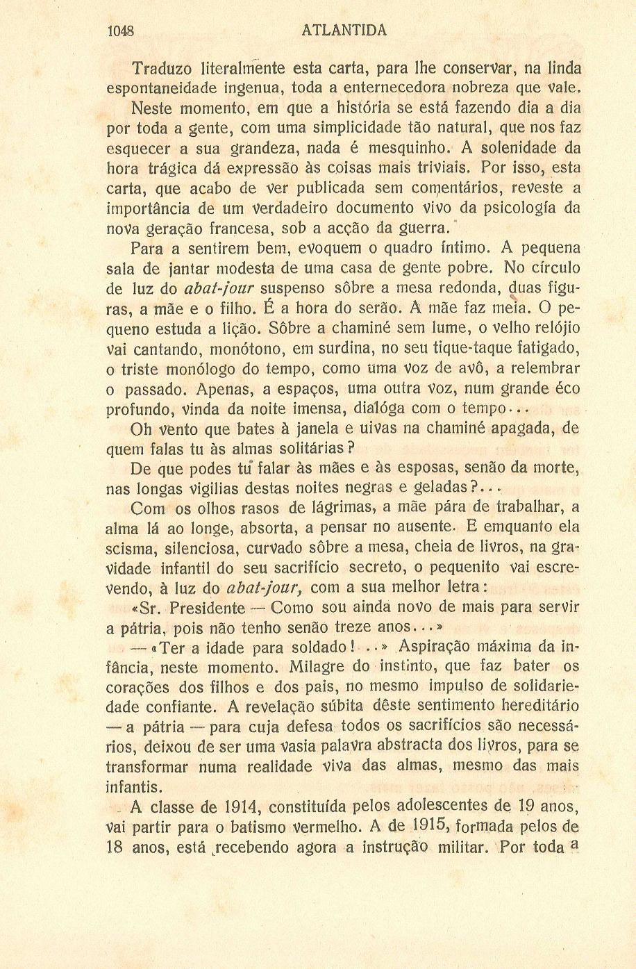 Atlântida : mensário artístico, literário e social para Portugal e Brasil N.º 35/36, [s.d.] 1919 Capa sumário rosto verso Museu de Arte Contemporânea : galeria de escultura Bufoneria heróica, por Aquilino Ribeiro A emoção e o sentido psicológico e moral dos " Nibelungen", por Henrique de Vilhena Intituto de Santa Isabel Revista do Mês Crónica artística Exposição de aguarela de Helena Roque Gameiro Quarta Exposição de aguarela, desenho e miniatura da Sociedade Nacional de Belas-Artes Exposição Álvaro da Fonseca ; Exposição Ernesto do Canto Exposição de quadros e desenhos de Frank Craig, por Manuel de Sousa Pinto 1086 Via Latina, por Sandoz O mês literário Habitação particular para o parque Estoril : projecto de José Pacheco publicidade contracapa | N.º 35/36, [s.d.] 1919 > A infância heróica, por Justino de Montalvão > 1048 |