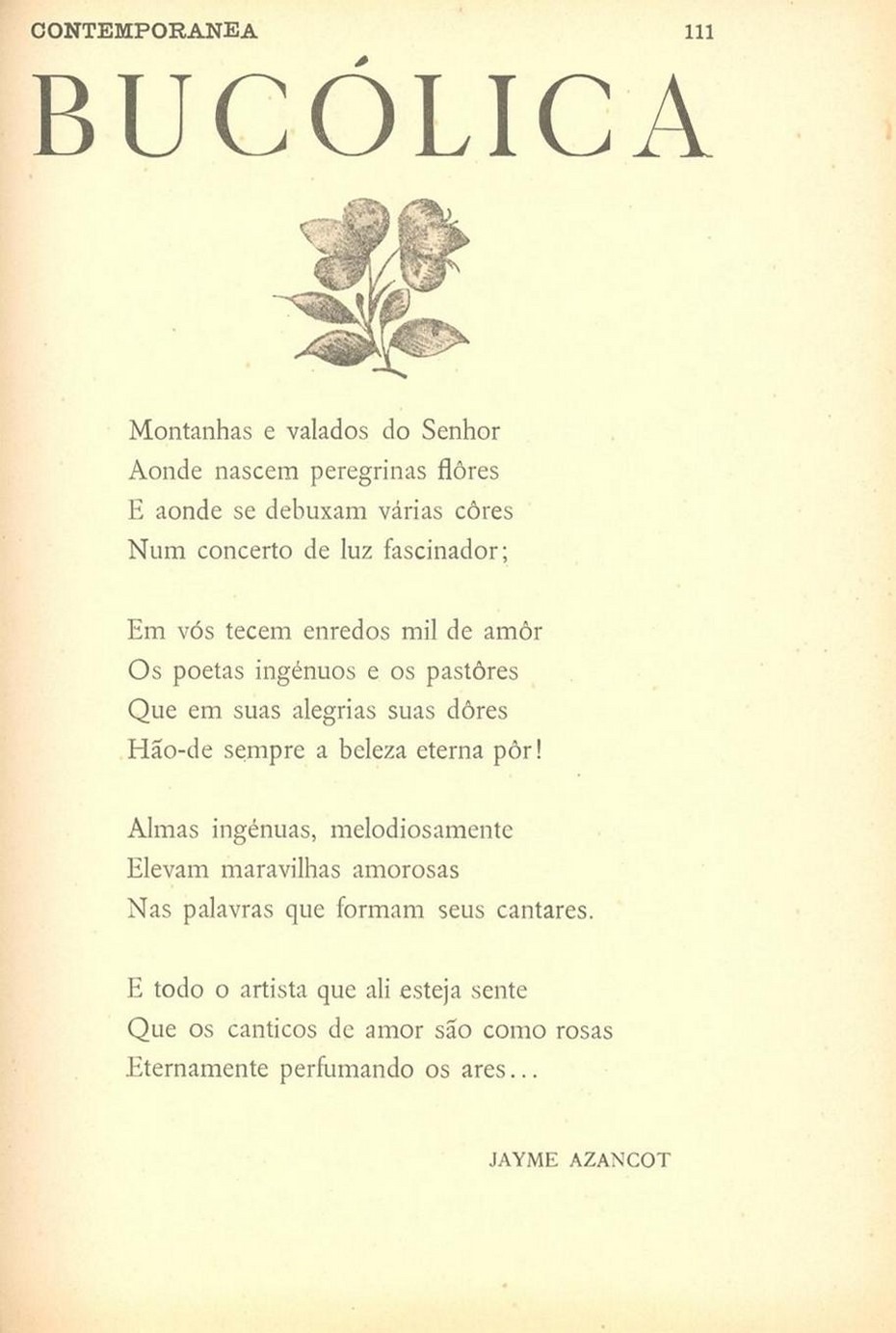 Contemporânea Vol. 3, N.º 8, Fev. 1923 capa Sumário Trompas de Santo Huberto, por Carlos de Vasconcelos Procissão em Amarante, por Amadeu de Sousa Cardoso Interiores de minha casa, por Afonso Duarte Ponte do Carrousel, por Dórdio Gomes Nas Dionysiacas, por Cândido Guerreiro Escultura, por Diogo de Macedo Pelo Tejo, por Motta Cabral Metade, por Luís Moita Teran, por Almada Negreiros Manhã de Cerração, versos de António Correia de Oliveira, música de Cláudio Carneiro Pousada de Ciganos, por Eduardo Vianna Lisbon Revisited (1923), por Álvaro de Campos Soneto, por Fortunato Velez La niña de la cabellera grande, por Eva Aggirhalna Efeitos da civilização Bucólica, por Jayme Azancot Solidão, por Jayme Azancot publicidade contracapa | Vol. 3, N.º 8, Fev. 1923 > Bucólica, por Jayme Azancot > 0111 |
