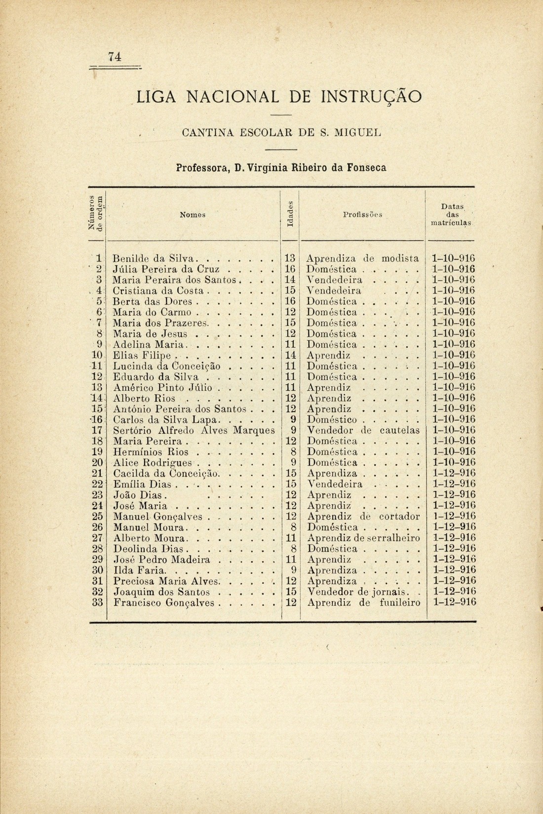 Liga Nacional de Instrução : arquivo dos seus trabalhos Série II, n.º 3 e 4, Julho a Dezembro de 1916 A guerra e a higiene escolar : Relatório apresentado à Sociedade de Medicina Pública e de Engenharia Sanitária de França pelo Dr. Mosny, membro da Academia de Medicina Uma carta dirigida ao jornal "A Capital" a propósito dos nossos cursos nocturnos, por M. Borges Grainha Extracto das actas das reùniões da Direcção da Liga : (De Julho a Dezembro de 1916) Canções escolares classificadas no IV Congresso Pedagógico celebrado em Abril de 1914 0066 Mapas estatísticos dos cursos subsidiados pela Liga : (ver pá. 62) 0084 Comissões pedagógicas eleitas na assembleia geral realizada em 22 de Maio de 1908 Arquivo da Liga Nacional de Instrução; Direcção da Liga Nacional de Instrução de Maio de 1916 a Maio de 1919 | Série II, n.º 3 e 4, Julho a Dezembro de 1916 > Mapas estatísticos dos cursos subsidiados pela Liga : (ver pá. 62) > Cantina Escolar de S. Miguel > 0074 |