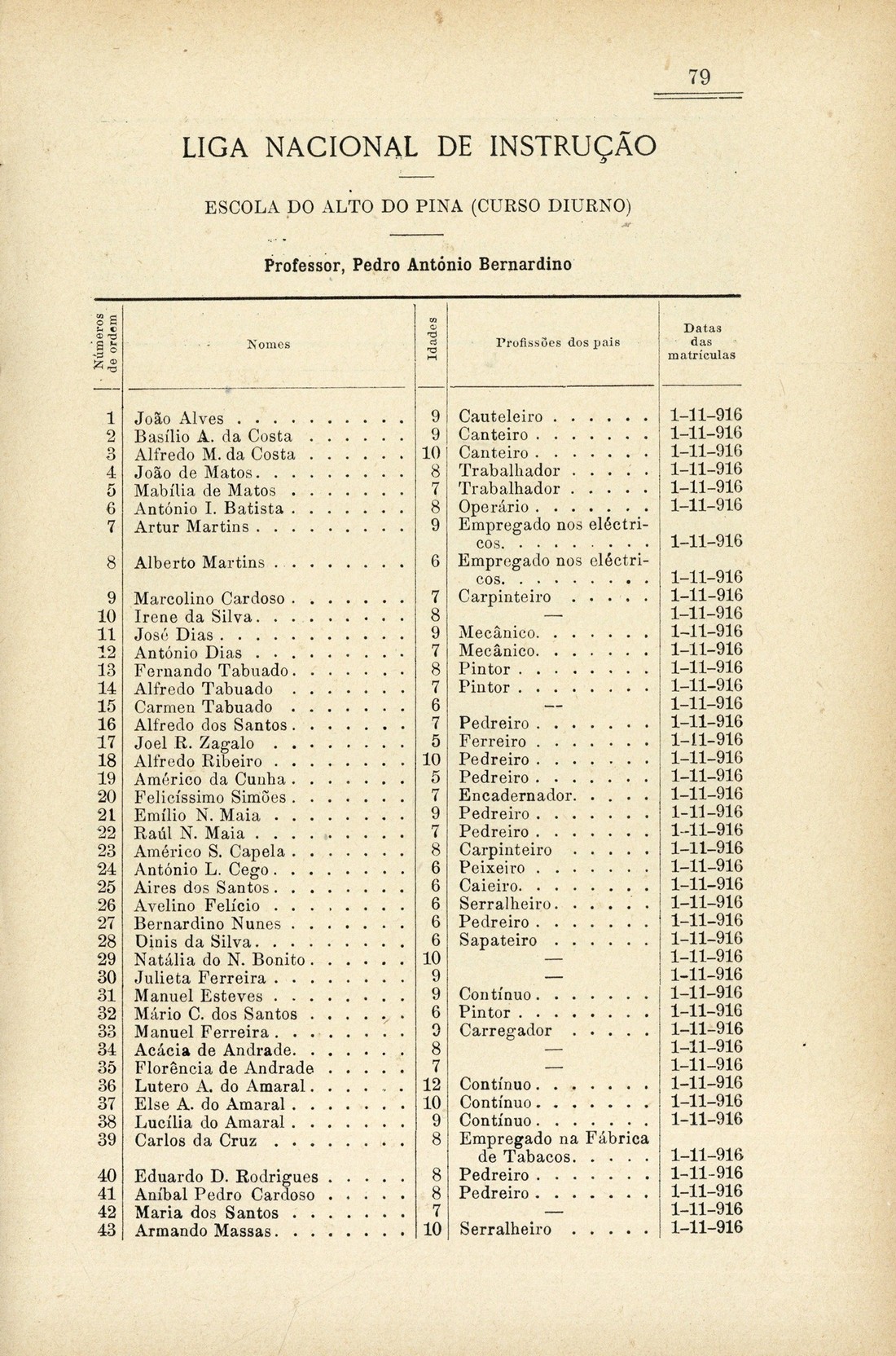 Liga Nacional de Instrução : arquivo dos seus trabalhos Série II, n.º 3 e 4, Julho a Dezembro de 1916 A guerra e a higiene escolar : Relatório apresentado à Sociedade de Medicina Pública e de Engenharia Sanitária de França pelo Dr. Mosny, membro da Academia de Medicina Uma carta dirigida ao jornal "A Capital" a propósito dos nossos cursos nocturnos, por M. Borges Grainha Extracto das actas das reùniões da Direcção da Liga : (De Julho a Dezembro de 1916) Canções escolares classificadas no IV Congresso Pedagógico celebrado em Abril de 1914 0066 Mapas estatísticos dos cursos subsidiados pela Liga : (ver pá. 62) 0084 Comissões pedagógicas eleitas na assembleia geral realizada em 22 de Maio de 1908 Arquivo da Liga Nacional de Instrução; Direcção da Liga Nacional de Instrução de Maio de 1916 a Maio de 1919 | Série II, n.º 3 e 4, Julho a Dezembro de 1916 > Mapas estatísticos dos cursos subsidiados pela Liga : (ver pá. 62) > Escola do Alto do Pina > 0079 |