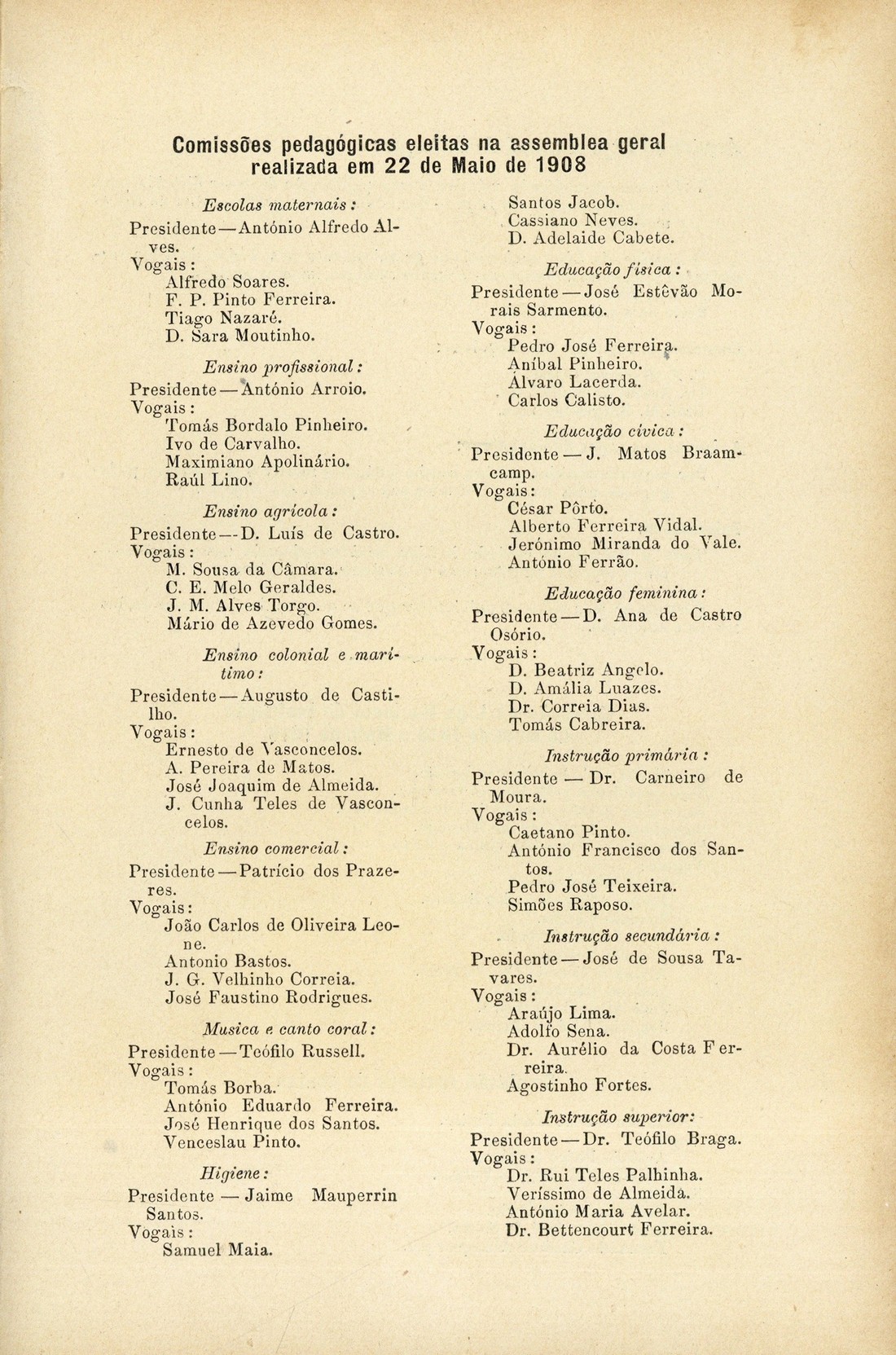Liga Nacional de Instrução : arquivo dos seus trabalhos Série II, n.º 3 e 4, Julho a Dezembro de 1916 A guerra e a higiene escolar : Relatório apresentado à Sociedade de Medicina Pública e de Engenharia Sanitária de França pelo Dr. Mosny, membro da Academia de Medicina Uma carta dirigida ao jornal "A Capital" a propósito dos nossos cursos nocturnos, por M. Borges Grainha Extracto das actas das reùniões da Direcção da Liga : (De Julho a Dezembro de 1916) Canções escolares classificadas no IV Congresso Pedagógico celebrado em Abril de 1914 0066 Mapas estatísticos dos cursos subsidiados pela Liga : (ver pá. 62) 0084 Comissões pedagógicas eleitas na assembleia geral realizada em 22 de Maio de 1908 Arquivo da Liga Nacional de Instrução; Direcção da Liga Nacional de Instrução de Maio de 1916 a Maio de 1919 | Série II, n.º 3 e 4, Julho a Dezembro de 1916 > Comissões pedagógicas eleitas na assembleia geral realizada em 22 de Maio de 1908 > 0085 |