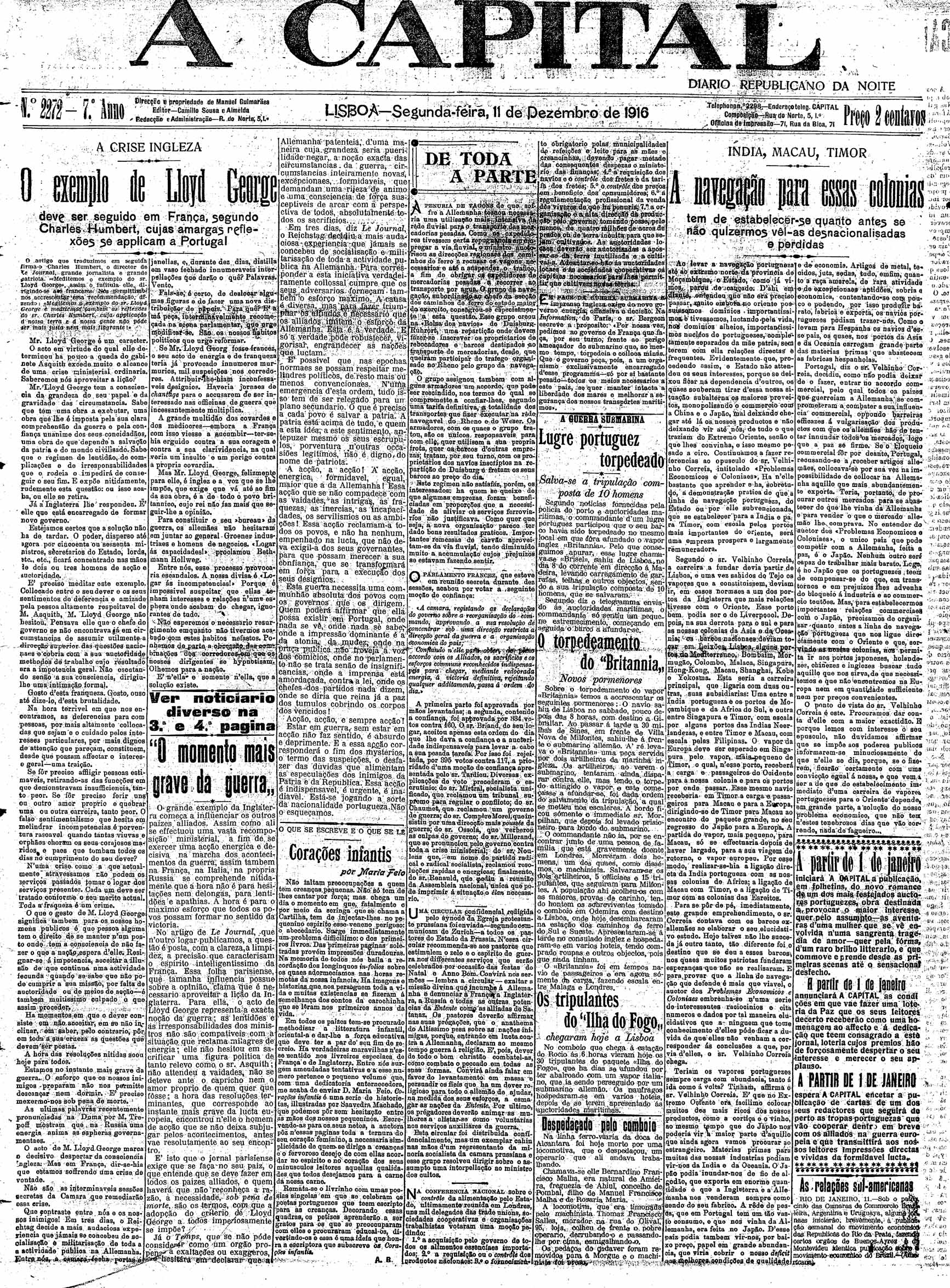 A Capital : diario republicano da noite Dezembro de 1916, n.º 2263 a n.º 2291 | Dezembro de 1916, n.º 2263 a n.º 2291 > N.º 2272 (11 Dez.) > 0001 |
