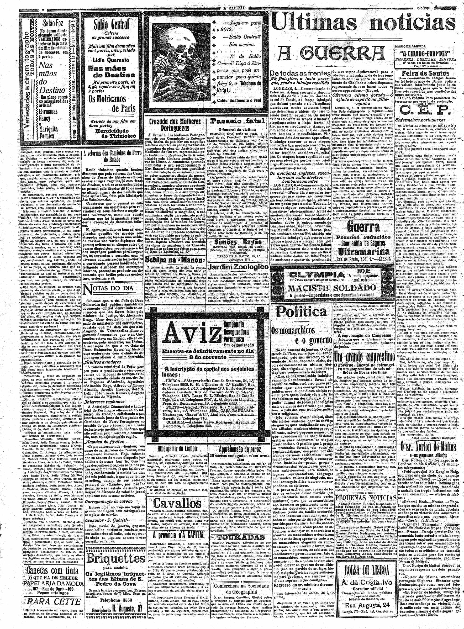 A Capital : diario republicano da noite Maio de 1918, n.º 2762 a n.º 2792 | Maio de 1918, n.º 2762 a n.º 2792 > N.º 2767 (6 Maio) > 0002 |