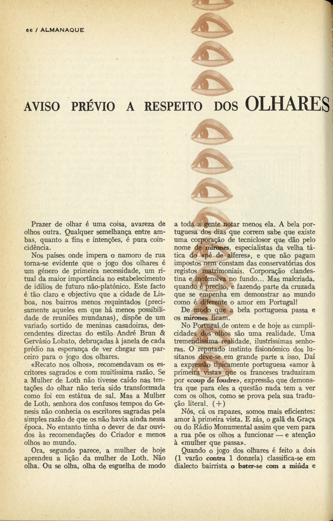 Dezembro 1960-Janeiro 1961capa verso 0001 0002 0003 0004 0005 0006 0007 sumário Os prazeres dos homens... O prazer de ser diferente Cardano : cientista do jogo O conto dos chineses, por José Cardoso Pires Elogio do coleccionador romântico Carta de instrução ao perfeito bebedor A arte muda e surda de criticar O pior são as filigranas, por Leitão de Barros Quem não quer ser homem não lhe veste a pele Manifesto suave pela reeducação dos adultos Aviso prévio a respeito dos olhares aváros & outros exercícios correlativos Breve roteiro do vampiro amador Fábulas para o nosso tempo, por James Thurber Novissimo Jogo da Glória do cidadão requintado Psicologia e ética do nacional automobilismo Os prazeres de além-túmulo : com referência acidental ao cemitério dos mesmos Duarte : príncipe florentino de traça alcantarense, por Baptista-Bastos Se Di Stefano é o "Senhor Futebol" quem é Frenc Puskas? Voçê é de trato agradável? : teste psicológico Nazaré = Saint Tropez, fotos de João Martins O caso da safira voadora, conto policial por Francisco Branco Os actores do século passado, por Lourenço Rodrigues Pegadas pelo mato, conto por Somerset Maugham | Dezembro 1960-Janeiro 1961 > Aviso prévio a respeito dos olhares aváros & outros exercícios correlativos > 0066 Tipo:image/jpeg Tamanho:555 KB |