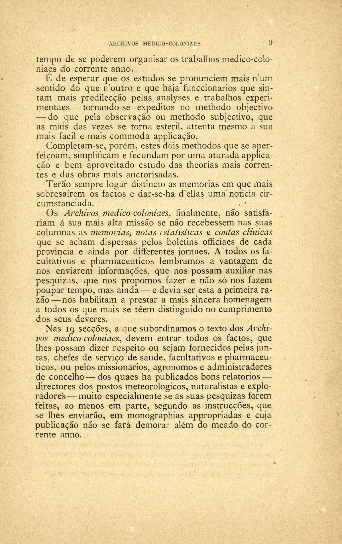 Archivos medico-coloniaes Numero Programma, Março, 1889 capa verso rosto Serviço de saude na Secretaria dos Negocios da Marinha e Ultramar Trabalhos que os facultativos do ultramar devem remetter para a secretaria de estado dos negocios de marinha e ultramar, segundo as disposições do decreto de 2 de dezembro de 1869 Principios fundamentaes, a que se deve attender no estudo dos climas, da emigração e da aclimação nas nossas possessões d'além-mar As grandes luctas da sciencia e da natureza nas terras da África Central Conclusões - sobre a aclimação - approvadas pelo congresso de hygiene e de demographia em Vienna d'Áustria Conclusões - sobre a mal'aria - approvadas pelo congresso de hygiene e de demographia em Vienna d'Áustria; Determinação da área geographica habitada por toda a familia portugueza nos fins do seculo XIX A anthropometria colonial Anthropometria militar A anthropometria policial Classificação geral das possessões portuguezas sob o ponto de vista da imigração e das relações dos indigenas com os europeus Hospital Maria Pia : Nota dos facultativos, sua graduação e concelhos onde se acham em commissão Relatorio do serviço de saude da provincia de Macau e Timor em relação ao anno de 1886, por José Gomes da Silva Caracter pratico e experimental dos trabalhos medico-coloniaes que se devem apresentar Necessidades do serviço de saude em cada uma das nossas provincias do ultramar Reforma da estatistica medica dos hospitaes do ultramar Material scientifico que mais importa obter para se resolverem as principaes questões medico-coloniaes Publicações feitas nas differentes provincias do ultramar; Aos medicos da armada real portugueza Merecidas distincções verso Summario | Numero Programma, Março, 1889 > Archivos medicos-coloniaes > 0009 |