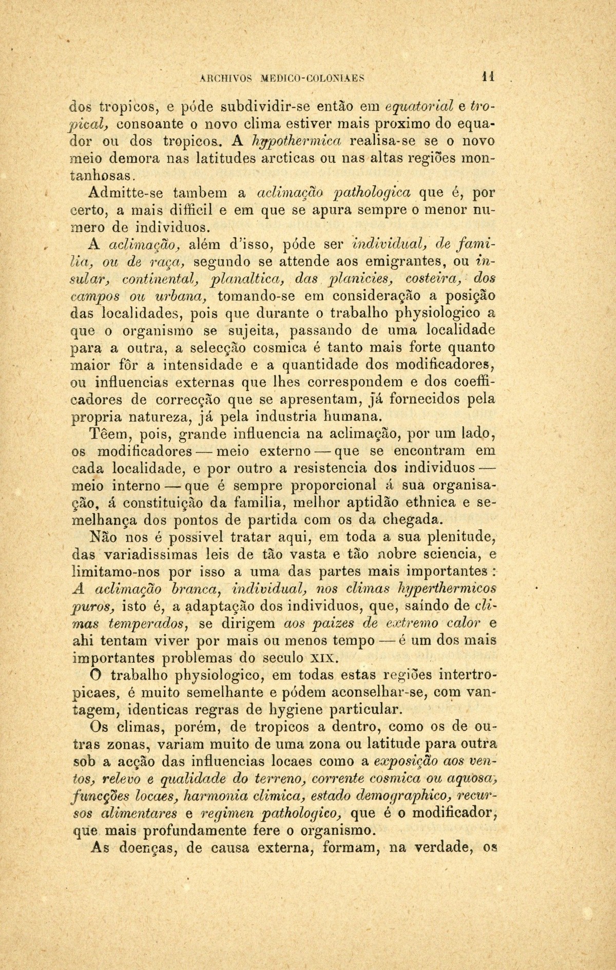 Archivos medico-coloniaes Numero Programma, Março, 1889 capa verso rosto Serviço de saude na Secretaria dos Negocios da Marinha e Ultramar Trabalhos que os facultativos do ultramar devem remetter para a secretaria de estado dos negocios de marinha e ultramar, segundo as disposições do decreto de 2 de dezembro de 1869 Principios fundamentaes, a que se deve attender no estudo dos climas, da emigração e da aclimação nas nossas possessões d'além-mar As grandes luctas da sciencia e da natureza nas terras da África Central Conclusões - sobre a aclimação - approvadas pelo congresso de hygiene e de demographia em Vienna d'Áustria Conclusões - sobre a mal'aria - approvadas pelo congresso de hygiene e de demographia em Vienna d'Áustria; Determinação da área geographica habitada por toda a familia portugueza nos fins do seculo XIX A anthropometria colonial Anthropometria militar A anthropometria policial Classificação geral das possessões portuguezas sob o ponto de vista da imigração e das relações dos indigenas com os europeus Hospital Maria Pia : Nota dos facultativos, sua graduação e concelhos onde se acham em commissão Relatorio do serviço de saude da provincia de Macau e Timor em relação ao anno de 1886, por José Gomes da Silva Caracter pratico e experimental dos trabalhos medico-coloniaes que se devem apresentar Necessidades do serviço de saude em cada uma das nossas provincias do ultramar Reforma da estatistica medica dos hospitaes do ultramar Material scientifico que mais importa obter para se resolverem as principaes questões medico-coloniaes Publicações feitas nas differentes provincias do ultramar; Aos medicos da armada real portugueza Merecidas distincções verso Summario | Numero Programma, Março, 1889 > Condições geraes da aclimação intertropical > 0011 |