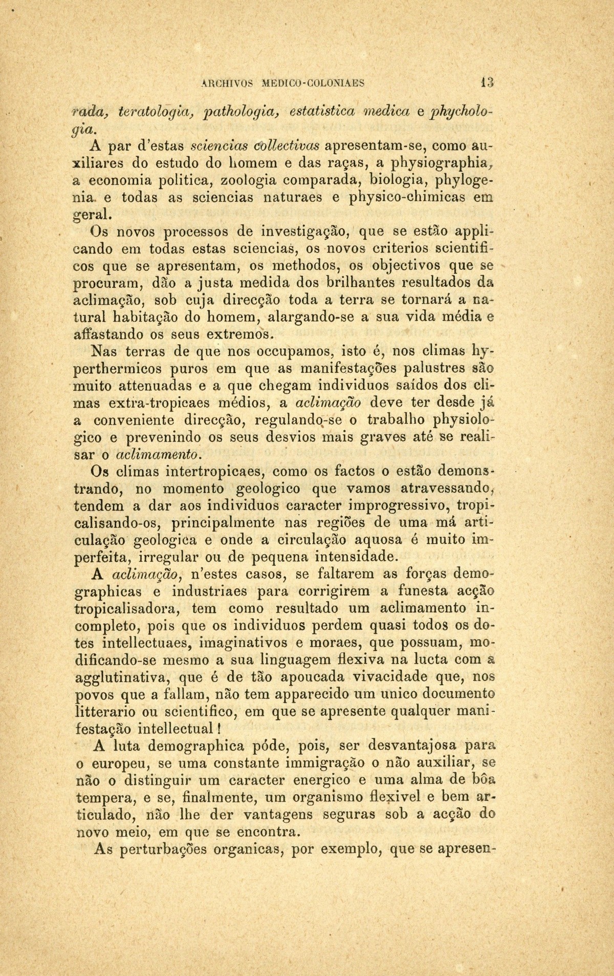 Archivos medico-coloniaes Numero Programma, Março, 1889 capa verso rosto Serviço de saude na Secretaria dos Negocios da Marinha e Ultramar Trabalhos que os facultativos do ultramar devem remetter para a secretaria de estado dos negocios de marinha e ultramar, segundo as disposições do decreto de 2 de dezembro de 1869 Principios fundamentaes, a que se deve attender no estudo dos climas, da emigração e da aclimação nas nossas possessões d'além-mar As grandes luctas da sciencia e da natureza nas terras da África Central Conclusões - sobre a aclimação - approvadas pelo congresso de hygiene e de demographia em Vienna d'Áustria Conclusões - sobre a mal'aria - approvadas pelo congresso de hygiene e de demographia em Vienna d'Áustria; Determinação da área geographica habitada por toda a familia portugueza nos fins do seculo XIX A anthropometria colonial Anthropometria militar A anthropometria policial Classificação geral das possessões portuguezas sob o ponto de vista da imigração e das relações dos indigenas com os europeus Hospital Maria Pia : Nota dos facultativos, sua graduação e concelhos onde se acham em commissão Relatorio do serviço de saude da provincia de Macau e Timor em relação ao anno de 1886, por José Gomes da Silva Caracter pratico e experimental dos trabalhos medico-coloniaes que se devem apresentar Necessidades do serviço de saude em cada uma das nossas provincias do ultramar Reforma da estatistica medica dos hospitaes do ultramar Material scientifico que mais importa obter para se resolverem as principaes questões medico-coloniaes Publicações feitas nas differentes provincias do ultramar; Aos medicos da armada real portugueza Merecidas distincções verso Summario | Numero Programma, Março, 1889 > Condições geraes da aclimação intertropical > 0013 |