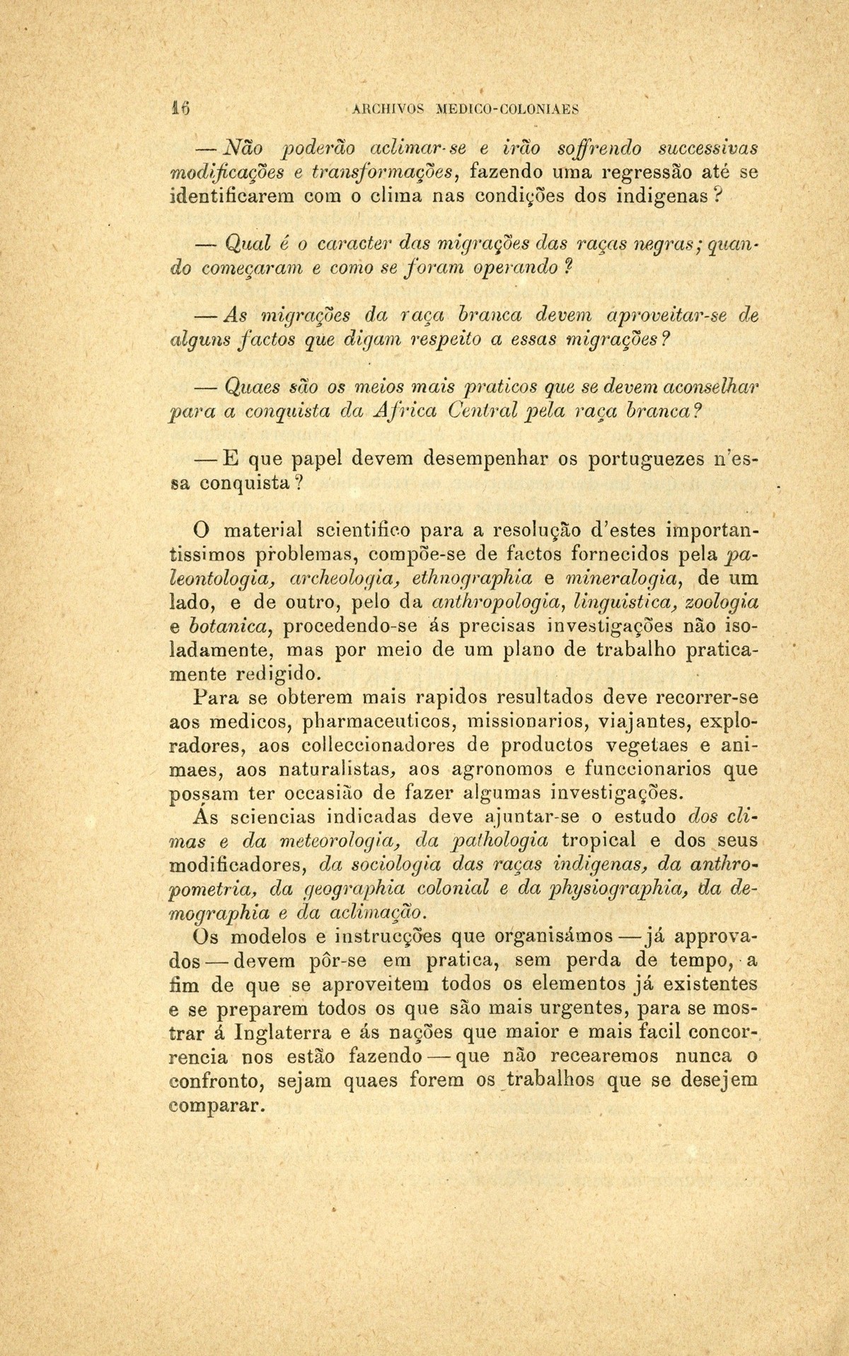 Archivos medico-coloniaes Numero Programma, Março, 1889 capa verso rosto Serviço de saude na Secretaria dos Negocios da Marinha e Ultramar Trabalhos que os facultativos do ultramar devem remetter para a secretaria de estado dos negocios de marinha e ultramar, segundo as disposições do decreto de 2 de dezembro de 1869 Principios fundamentaes, a que se deve attender no estudo dos climas, da emigração e da aclimação nas nossas possessões d'além-mar As grandes luctas da sciencia e da natureza nas terras da África Central Conclusões - sobre a aclimação - approvadas pelo congresso de hygiene e de demographia em Vienna d'Áustria Conclusões - sobre a mal'aria - approvadas pelo congresso de hygiene e de demographia em Vienna d'Áustria; Determinação da área geographica habitada por toda a familia portugueza nos fins do seculo XIX A anthropometria colonial Anthropometria militar A anthropometria policial Classificação geral das possessões portuguezas sob o ponto de vista da imigração e das relações dos indigenas com os europeus Hospital Maria Pia : Nota dos facultativos, sua graduação e concelhos onde se acham em commissão Relatorio do serviço de saude da provincia de Macau e Timor em relação ao anno de 1886, por José Gomes da Silva Caracter pratico e experimental dos trabalhos medico-coloniaes que se devem apresentar Necessidades do serviço de saude em cada uma das nossas provincias do ultramar Reforma da estatistica medica dos hospitaes do ultramar Material scientifico que mais importa obter para se resolverem as principaes questões medico-coloniaes Publicações feitas nas differentes provincias do ultramar; Aos medicos da armada real portugueza Merecidas distincções verso Summario | Numero Programma, Março, 1889 > Os problemas d'aclimação a que mais urge attender > 0016 |