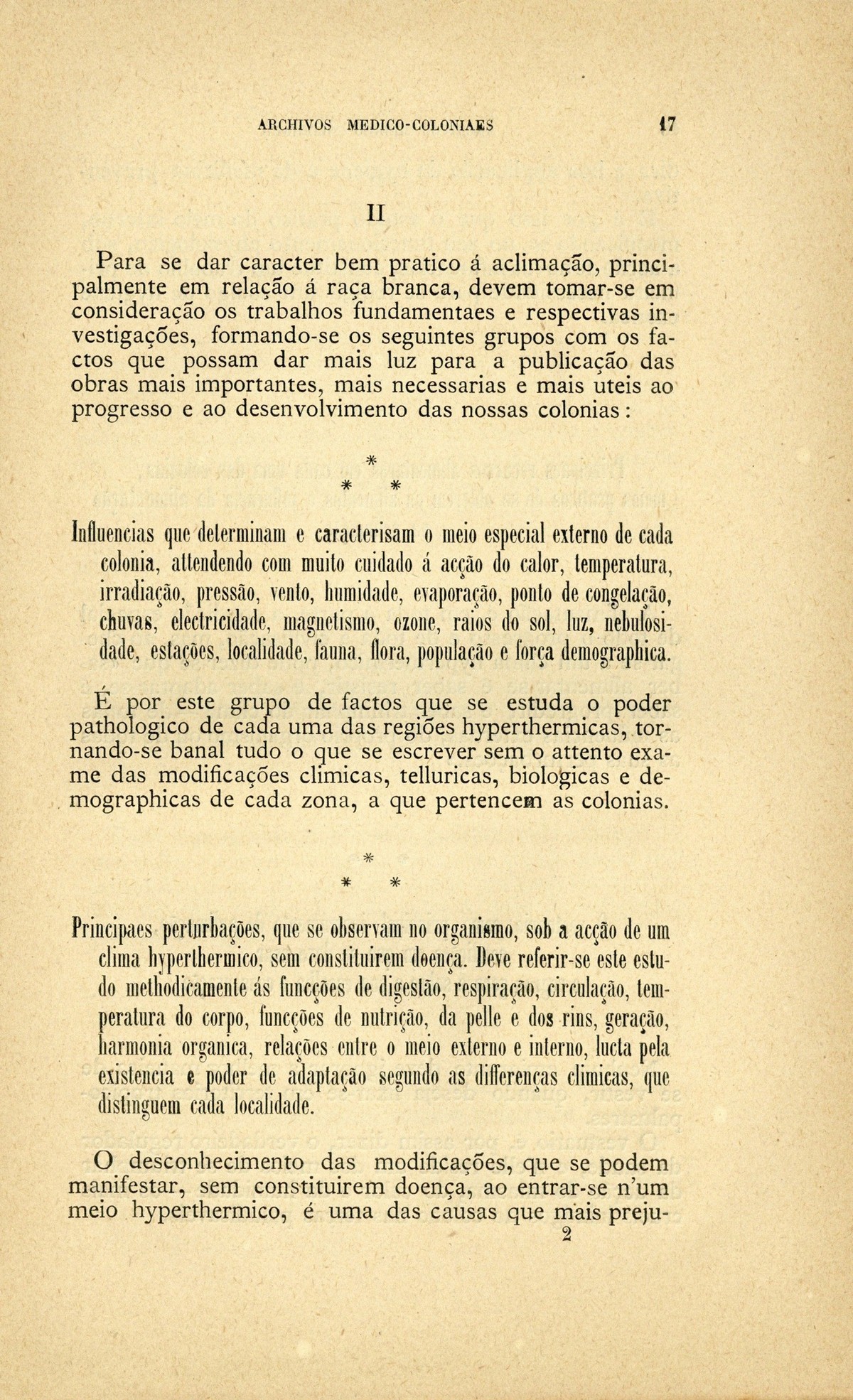 Archivos medico-coloniaes Numero Programma, Março, 1889 capa verso rosto Serviço de saude na Secretaria dos Negocios da Marinha e Ultramar Trabalhos que os facultativos do ultramar devem remetter para a secretaria de estado dos negocios de marinha e ultramar, segundo as disposições do decreto de 2 de dezembro de 1869 Principios fundamentaes, a que se deve attender no estudo dos climas, da emigração e da aclimação nas nossas possessões d'além-mar As grandes luctas da sciencia e da natureza nas terras da África Central Conclusões - sobre a aclimação - approvadas pelo congresso de hygiene e de demographia em Vienna d'Áustria Conclusões - sobre a mal'aria - approvadas pelo congresso de hygiene e de demographia em Vienna d'Áustria; Determinação da área geographica habitada por toda a familia portugueza nos fins do seculo XIX A anthropometria colonial Anthropometria militar A anthropometria policial Classificação geral das possessões portuguezas sob o ponto de vista da imigração e das relações dos indigenas com os europeus Hospital Maria Pia : Nota dos facultativos, sua graduação e concelhos onde se acham em commissão Relatorio do serviço de saude da provincia de Macau e Timor em relação ao anno de 1886, por José Gomes da Silva Caracter pratico e experimental dos trabalhos medico-coloniaes que se devem apresentar Necessidades do serviço de saude em cada uma das nossas provincias do ultramar Reforma da estatistica medica dos hospitaes do ultramar Material scientifico que mais importa obter para se resolverem as principaes questões medico-coloniaes Publicações feitas nas differentes provincias do ultramar; Aos medicos da armada real portugueza Merecidas distincções verso Summario | Numero Programma, Março, 1889 > Os problemas d'aclimação a que mais urge attender > 0017 |