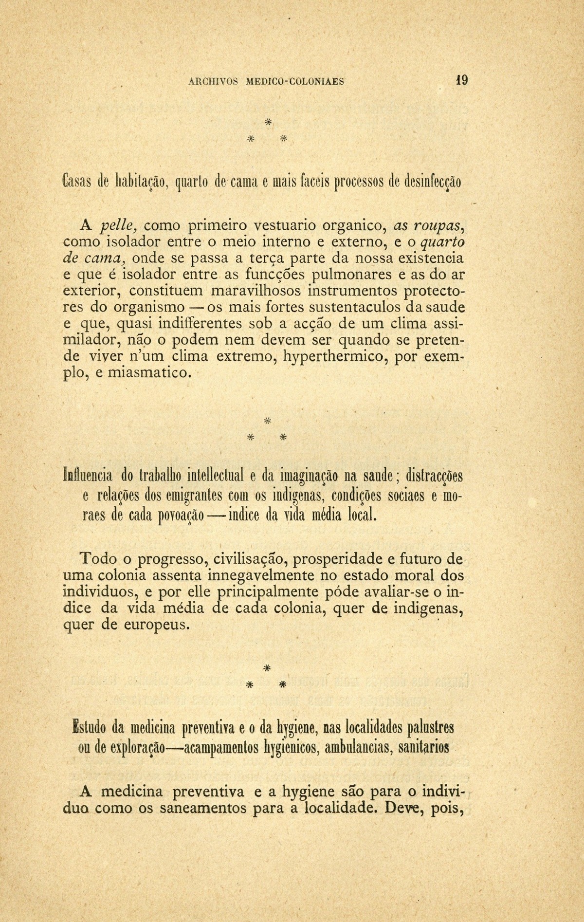 Archivos medico-coloniaes Numero Programma, Março, 1889 capa verso rosto Serviço de saude na Secretaria dos Negocios da Marinha e Ultramar Trabalhos que os facultativos do ultramar devem remetter para a secretaria de estado dos negocios de marinha e ultramar, segundo as disposições do decreto de 2 de dezembro de 1869 Principios fundamentaes, a que se deve attender no estudo dos climas, da emigração e da aclimação nas nossas possessões d'além-mar As grandes luctas da sciencia e da natureza nas terras da África Central Conclusões - sobre a aclimação - approvadas pelo congresso de hygiene e de demographia em Vienna d'Áustria Conclusões - sobre a mal'aria - approvadas pelo congresso de hygiene e de demographia em Vienna d'Áustria; Determinação da área geographica habitada por toda a familia portugueza nos fins do seculo XIX A anthropometria colonial Anthropometria militar A anthropometria policial Classificação geral das possessões portuguezas sob o ponto de vista da imigração e das relações dos indigenas com os europeus Hospital Maria Pia : Nota dos facultativos, sua graduação e concelhos onde se acham em commissão Relatorio do serviço de saude da provincia de Macau e Timor em relação ao anno de 1886, por José Gomes da Silva Caracter pratico e experimental dos trabalhos medico-coloniaes que se devem apresentar Necessidades do serviço de saude em cada uma das nossas provincias do ultramar Reforma da estatistica medica dos hospitaes do ultramar Material scientifico que mais importa obter para se resolverem as principaes questões medico-coloniaes Publicações feitas nas differentes provincias do ultramar; Aos medicos da armada real portugueza Merecidas distincções verso Summario | Numero Programma, Março, 1889 > Os problemas d'aclimação a que mais urge attender > 0019 |