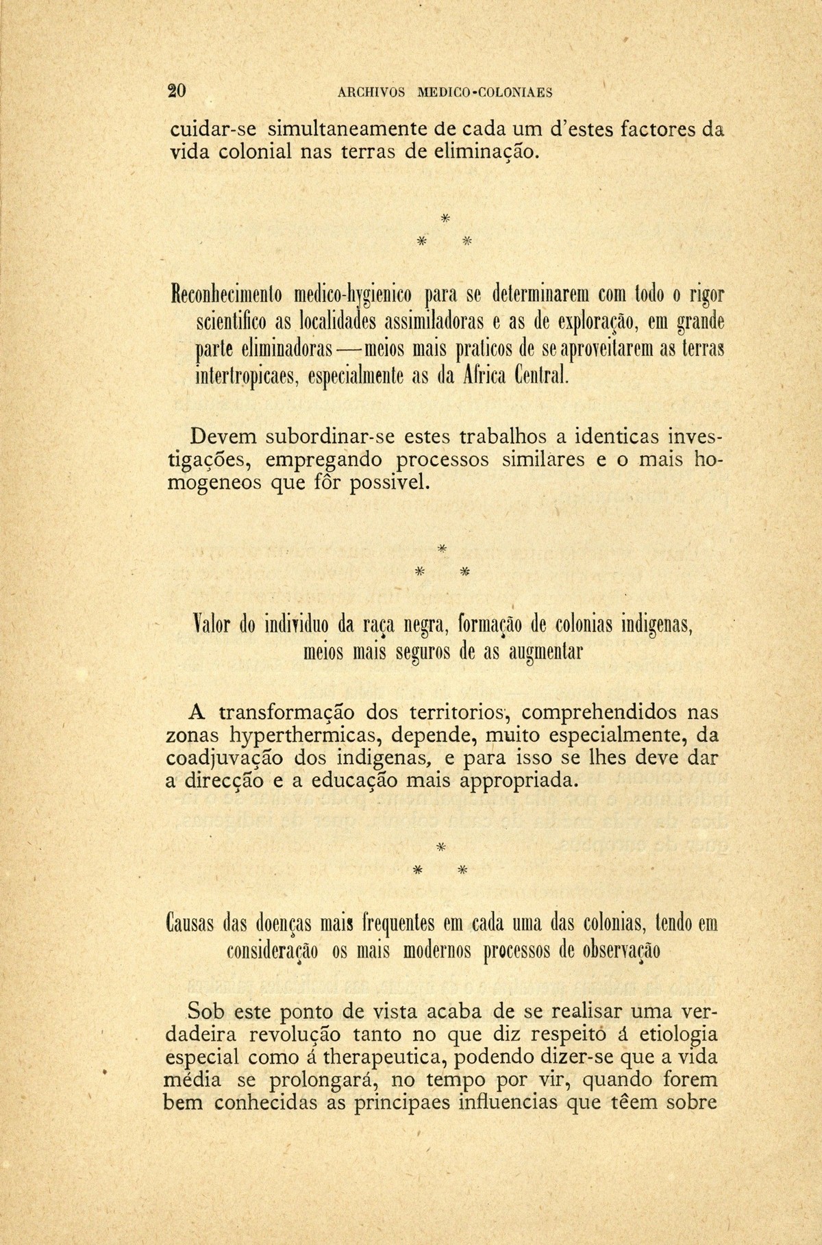 Archivos medico-coloniaes Numero Programma, Março, 1889 capa verso rosto Serviço de saude na Secretaria dos Negocios da Marinha e Ultramar Trabalhos que os facultativos do ultramar devem remetter para a secretaria de estado dos negocios de marinha e ultramar, segundo as disposições do decreto de 2 de dezembro de 1869 Principios fundamentaes, a que se deve attender no estudo dos climas, da emigração e da aclimação nas nossas possessões d'além-mar As grandes luctas da sciencia e da natureza nas terras da África Central Conclusões - sobre a aclimação - approvadas pelo congresso de hygiene e de demographia em Vienna d'Áustria Conclusões - sobre a mal'aria - approvadas pelo congresso de hygiene e de demographia em Vienna d'Áustria; Determinação da área geographica habitada por toda a familia portugueza nos fins do seculo XIX A anthropometria colonial Anthropometria militar A anthropometria policial Classificação geral das possessões portuguezas sob o ponto de vista da imigração e das relações dos indigenas com os europeus Hospital Maria Pia : Nota dos facultativos, sua graduação e concelhos onde se acham em commissão Relatorio do serviço de saude da provincia de Macau e Timor em relação ao anno de 1886, por José Gomes da Silva Caracter pratico e experimental dos trabalhos medico-coloniaes que se devem apresentar Necessidades do serviço de saude em cada uma das nossas provincias do ultramar Reforma da estatistica medica dos hospitaes do ultramar Material scientifico que mais importa obter para se resolverem as principaes questões medico-coloniaes Publicações feitas nas differentes provincias do ultramar; Aos medicos da armada real portugueza Merecidas distincções verso Summario | Numero Programma, Março, 1889 > Os problemas d'aclimação a que mais urge attender > 0020 |