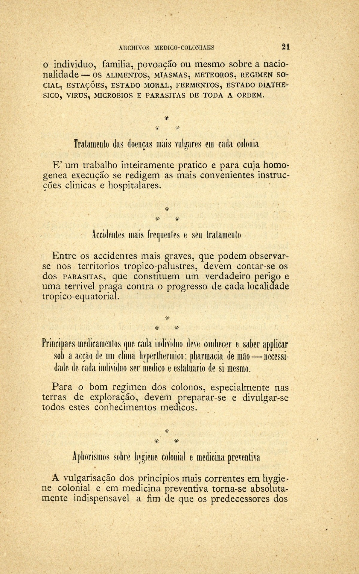 Archivos medico-coloniaes Numero Programma, Março, 1889 capa verso rosto Serviço de saude na Secretaria dos Negocios da Marinha e Ultramar Trabalhos que os facultativos do ultramar devem remetter para a secretaria de estado dos negocios de marinha e ultramar, segundo as disposições do decreto de 2 de dezembro de 1869 Principios fundamentaes, a que se deve attender no estudo dos climas, da emigração e da aclimação nas nossas possessões d'além-mar As grandes luctas da sciencia e da natureza nas terras da África Central Conclusões - sobre a aclimação - approvadas pelo congresso de hygiene e de demographia em Vienna d'Áustria Conclusões - sobre a mal'aria - approvadas pelo congresso de hygiene e de demographia em Vienna d'Áustria; Determinação da área geographica habitada por toda a familia portugueza nos fins do seculo XIX A anthropometria colonial Anthropometria militar A anthropometria policial Classificação geral das possessões portuguezas sob o ponto de vista da imigração e das relações dos indigenas com os europeus Hospital Maria Pia : Nota dos facultativos, sua graduação e concelhos onde se acham em commissão Relatorio do serviço de saude da provincia de Macau e Timor em relação ao anno de 1886, por José Gomes da Silva Caracter pratico e experimental dos trabalhos medico-coloniaes que se devem apresentar Necessidades do serviço de saude em cada uma das nossas provincias do ultramar Reforma da estatistica medica dos hospitaes do ultramar Material scientifico que mais importa obter para se resolverem as principaes questões medico-coloniaes Publicações feitas nas differentes provincias do ultramar; Aos medicos da armada real portugueza Merecidas distincções verso Summario | Numero Programma, Março, 1889 > Os problemas d'aclimação a que mais urge attender > 0021 |