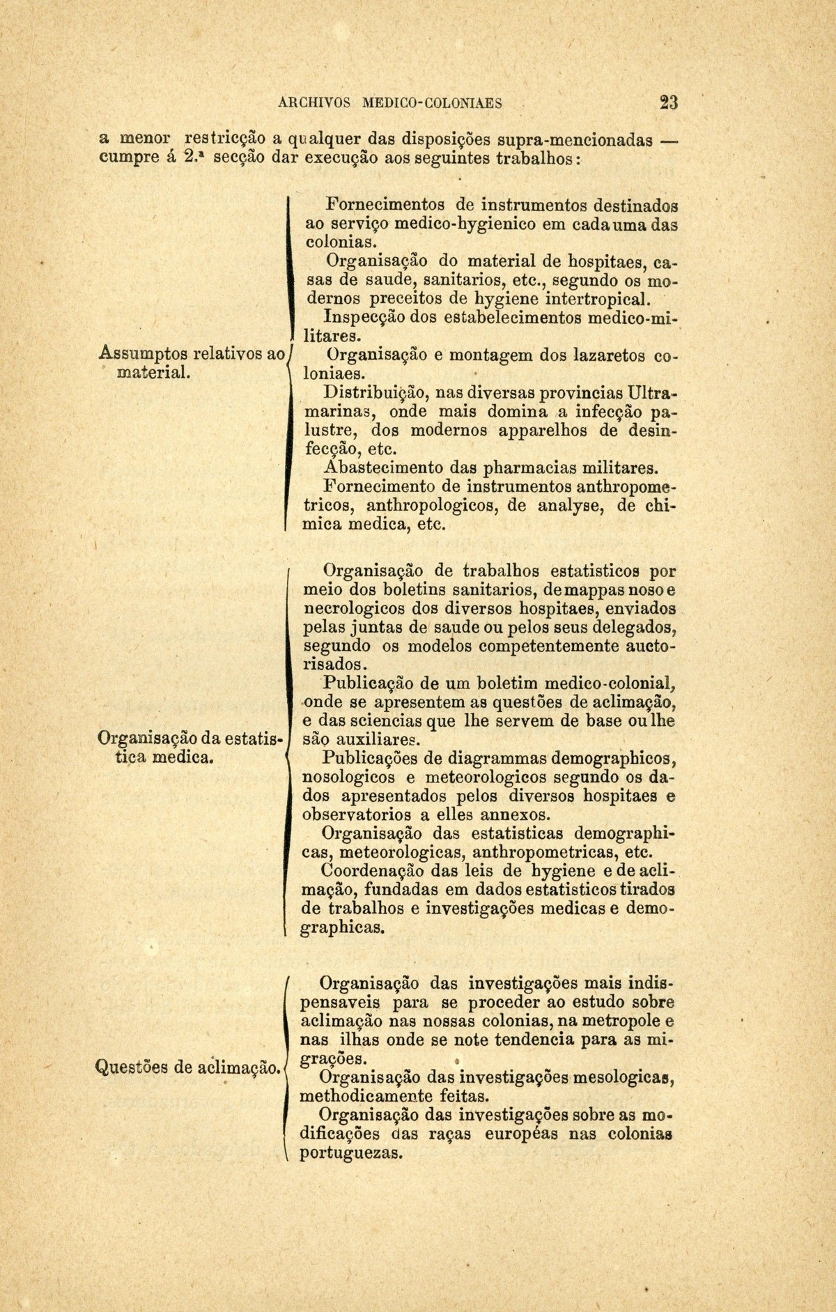Archivos medico-coloniaes Numero Programma, Março, 1889 capa verso rosto Serviço de saude na Secretaria dos Negocios da Marinha e Ultramar Trabalhos que os facultativos do ultramar devem remetter para a secretaria de estado dos negocios de marinha e ultramar, segundo as disposições do decreto de 2 de dezembro de 1869 Principios fundamentaes, a que se deve attender no estudo dos climas, da emigração e da aclimação nas nossas possessões d'além-mar As grandes luctas da sciencia e da natureza nas terras da África Central Conclusões - sobre a aclimação - approvadas pelo congresso de hygiene e de demographia em Vienna d'Áustria Conclusões - sobre a mal'aria - approvadas pelo congresso de hygiene e de demographia em Vienna d'Áustria; Determinação da área geographica habitada por toda a familia portugueza nos fins do seculo XIX A anthropometria colonial Anthropometria militar A anthropometria policial Classificação geral das possessões portuguezas sob o ponto de vista da imigração e das relações dos indigenas com os europeus Hospital Maria Pia : Nota dos facultativos, sua graduação e concelhos onde se acham em commissão Relatorio do serviço de saude da provincia de Macau e Timor em relação ao anno de 1886, por José Gomes da Silva Caracter pratico e experimental dos trabalhos medico-coloniaes que se devem apresentar Necessidades do serviço de saude em cada uma das nossas provincias do ultramar Reforma da estatistica medica dos hospitaes do ultramar Material scientifico que mais importa obter para se resolverem as principaes questões medico-coloniaes Publicações feitas nas differentes provincias do ultramar; Aos medicos da armada real portugueza Merecidas distincções verso Summario | Numero Programma, Março, 1889 > Trabalhos a que é obrigada a 2ª secção medica da Direcção Geral do Ultramar > 0023 |