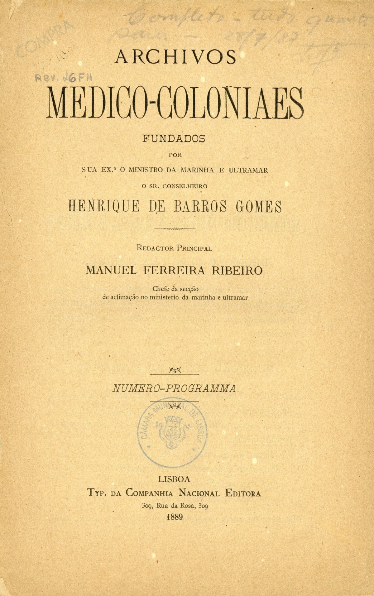 Archivos medico-coloniaes Numero Programma, Março, 1889 capa verso rosto Serviço de saude na Secretaria dos Negocios da Marinha e Ultramar Trabalhos que os facultativos do ultramar devem remetter para a secretaria de estado dos negocios de marinha e ultramar, segundo as disposições do decreto de 2 de dezembro de 1869 Principios fundamentaes, a que se deve attender no estudo dos climas, da emigração e da aclimação nas nossas possessões d'além-mar As grandes luctas da sciencia e da natureza nas terras da África Central Conclusões - sobre a aclimação - approvadas pelo congresso de hygiene e de demographia em Vienna d'Áustria Conclusões - sobre a mal'aria - approvadas pelo congresso de hygiene e de demographia em Vienna d'Áustria; Determinação da área geographica habitada por toda a familia portugueza nos fins do seculo XIX A anthropometria colonial Anthropometria militar A anthropometria policial Classificação geral das possessões portuguezas sob o ponto de vista da imigração e das relações dos indigenas com os europeus Hospital Maria Pia : Nota dos facultativos, sua graduação e concelhos onde se acham em commissão Relatorio do serviço de saude da provincia de Macau e Timor em relação ao anno de 1886, por José Gomes da Silva Caracter pratico e experimental dos trabalhos medico-coloniaes que se devem apresentar Necessidades do serviço de saude em cada uma das nossas provincias do ultramar Reforma da estatistica medica dos hospitaes do ultramar Material scientifico que mais importa obter para se resolverem as principaes questões medico-coloniaes Publicações feitas nas differentes provincias do ultramar; Aos medicos da armada real portugueza Merecidas distincções verso Summario | Numero Programma, Março, 1889 > rosto |