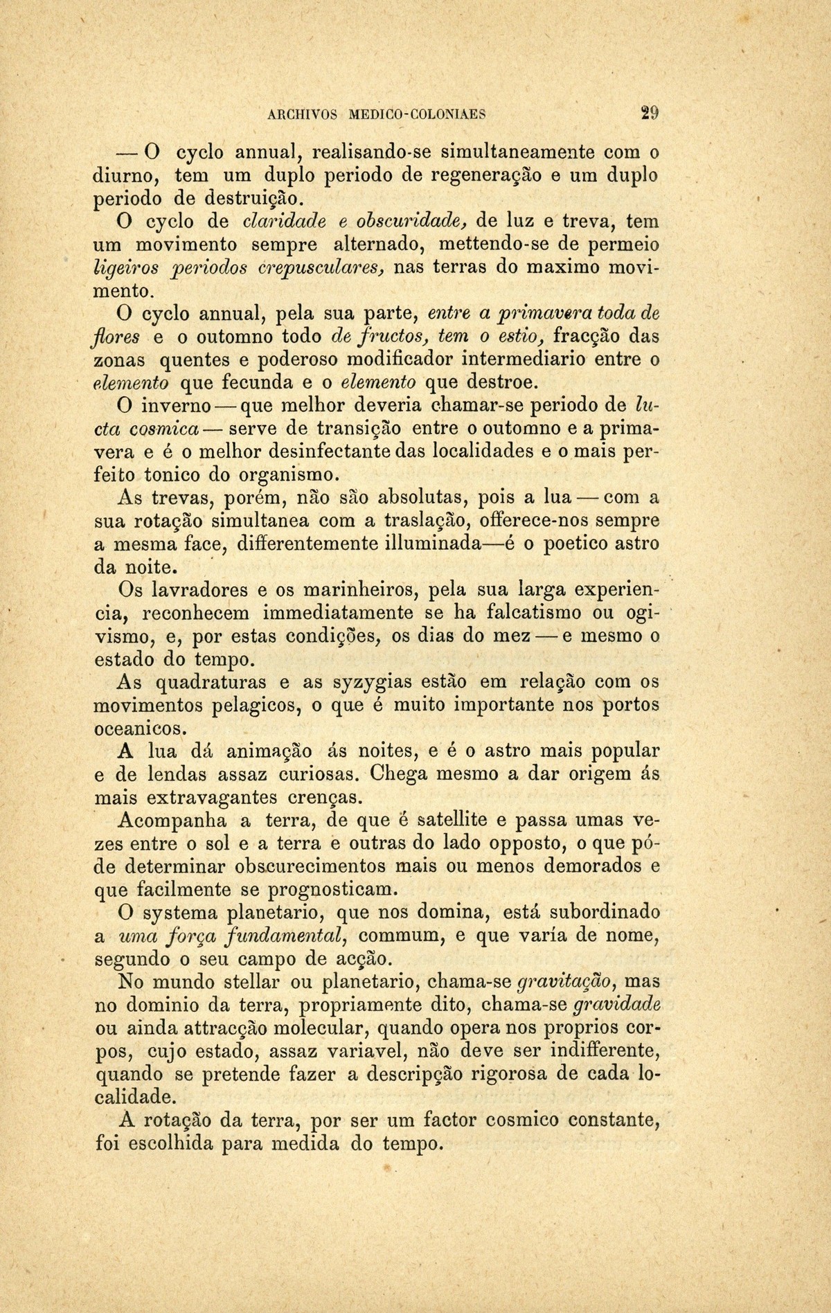 Archivos medico-coloniaes Numero Programma, Março, 1889 capa verso rosto Serviço de saude na Secretaria dos Negocios da Marinha e Ultramar Trabalhos que os facultativos do ultramar devem remetter para a secretaria de estado dos negocios de marinha e ultramar, segundo as disposições do decreto de 2 de dezembro de 1869 Principios fundamentaes, a que se deve attender no estudo dos climas, da emigração e da aclimação nas nossas possessões d'além-mar As grandes luctas da sciencia e da natureza nas terras da África Central Conclusões - sobre a aclimação - approvadas pelo congresso de hygiene e de demographia em Vienna d'Áustria Conclusões - sobre a mal'aria - approvadas pelo congresso de hygiene e de demographia em Vienna d'Áustria; Determinação da área geographica habitada por toda a familia portugueza nos fins do seculo XIX A anthropometria colonial Anthropometria militar A anthropometria policial Classificação geral das possessões portuguezas sob o ponto de vista da imigração e das relações dos indigenas com os europeus Hospital Maria Pia : Nota dos facultativos, sua graduação e concelhos onde se acham em commissão Relatorio do serviço de saude da provincia de Macau e Timor em relação ao anno de 1886, por José Gomes da Silva Caracter pratico e experimental dos trabalhos medico-coloniaes que se devem apresentar Necessidades do serviço de saude em cada uma das nossas provincias do ultramar Reforma da estatistica medica dos hospitaes do ultramar Material scientifico que mais importa obter para se resolverem as principaes questões medico-coloniaes Publicações feitas nas differentes provincias do ultramar; Aos medicos da armada real portugueza Merecidas distincções verso Summario | Numero Programma, Março, 1889 > Principios fundamentaes, a que se deve attender no estudo dos climas, da emigração e da aclimação nas nossas possessões d'além-mar > 0029 |