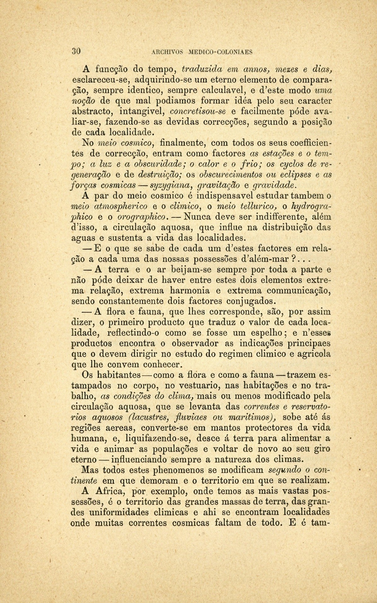 Archivos medico-coloniaes Numero Programma, Março, 1889 capa verso rosto Serviço de saude na Secretaria dos Negocios da Marinha e Ultramar Trabalhos que os facultativos do ultramar devem remetter para a secretaria de estado dos negocios de marinha e ultramar, segundo as disposições do decreto de 2 de dezembro de 1869 Principios fundamentaes, a que se deve attender no estudo dos climas, da emigração e da aclimação nas nossas possessões d'além-mar As grandes luctas da sciencia e da natureza nas terras da África Central Conclusões - sobre a aclimação - approvadas pelo congresso de hygiene e de demographia em Vienna d'Áustria Conclusões - sobre a mal'aria - approvadas pelo congresso de hygiene e de demographia em Vienna d'Áustria; Determinação da área geographica habitada por toda a familia portugueza nos fins do seculo XIX A anthropometria colonial Anthropometria militar A anthropometria policial Classificação geral das possessões portuguezas sob o ponto de vista da imigração e das relações dos indigenas com os europeus Hospital Maria Pia : Nota dos facultativos, sua graduação e concelhos onde se acham em commissão Relatorio do serviço de saude da provincia de Macau e Timor em relação ao anno de 1886, por José Gomes da Silva Caracter pratico e experimental dos trabalhos medico-coloniaes que se devem apresentar Necessidades do serviço de saude em cada uma das nossas provincias do ultramar Reforma da estatistica medica dos hospitaes do ultramar Material scientifico que mais importa obter para se resolverem as principaes questões medico-coloniaes Publicações feitas nas differentes provincias do ultramar; Aos medicos da armada real portugueza Merecidas distincções verso Summario | Numero Programma, Março, 1889 > Principios fundamentaes, a que se deve attender no estudo dos climas, da emigração e da aclimação nas nossas possessões d'além-mar > 0030 |