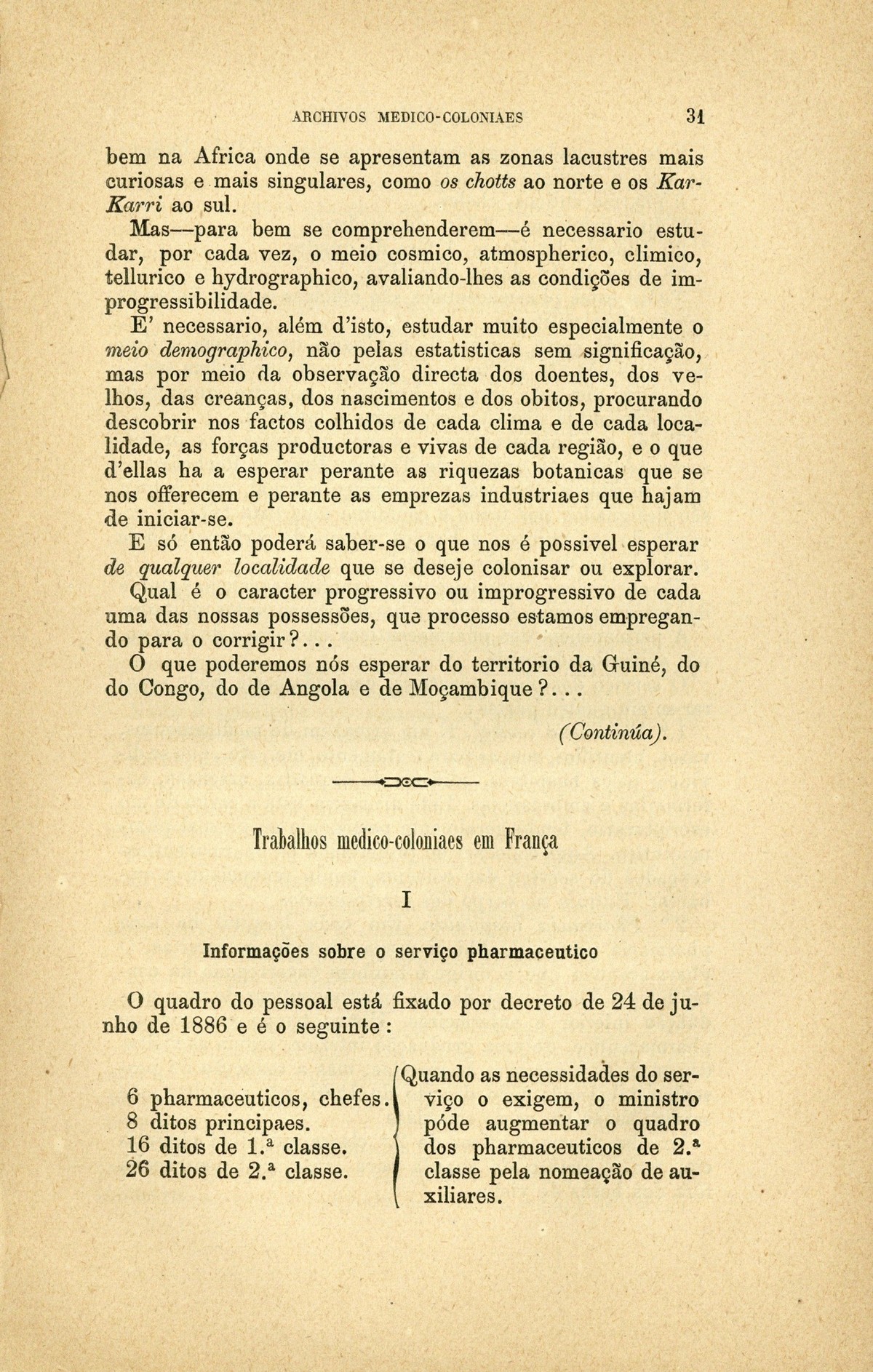 Archivos medico-coloniaes Numero Programma, Março, 1889 capa verso rosto Serviço de saude na Secretaria dos Negocios da Marinha e Ultramar Trabalhos que os facultativos do ultramar devem remetter para a secretaria de estado dos negocios de marinha e ultramar, segundo as disposições do decreto de 2 de dezembro de 1869 Principios fundamentaes, a que se deve attender no estudo dos climas, da emigração e da aclimação nas nossas possessões d'além-mar As grandes luctas da sciencia e da natureza nas terras da África Central Conclusões - sobre a aclimação - approvadas pelo congresso de hygiene e de demographia em Vienna d'Áustria Conclusões - sobre a mal'aria - approvadas pelo congresso de hygiene e de demographia em Vienna d'Áustria; Determinação da área geographica habitada por toda a familia portugueza nos fins do seculo XIX A anthropometria colonial Anthropometria militar A anthropometria policial Classificação geral das possessões portuguezas sob o ponto de vista da imigração e das relações dos indigenas com os europeus Hospital Maria Pia : Nota dos facultativos, sua graduação e concelhos onde se acham em commissão Relatorio do serviço de saude da provincia de Macau e Timor em relação ao anno de 1886, por José Gomes da Silva Caracter pratico e experimental dos trabalhos medico-coloniaes que se devem apresentar Necessidades do serviço de saude em cada uma das nossas provincias do ultramar Reforma da estatistica medica dos hospitaes do ultramar Material scientifico que mais importa obter para se resolverem as principaes questões medico-coloniaes Publicações feitas nas differentes provincias do ultramar; Aos medicos da armada real portugueza Merecidas distincções verso Summario | Numero Programma, Março, 1889 > Trabalhos medico-coloniaes em França > 0031 |