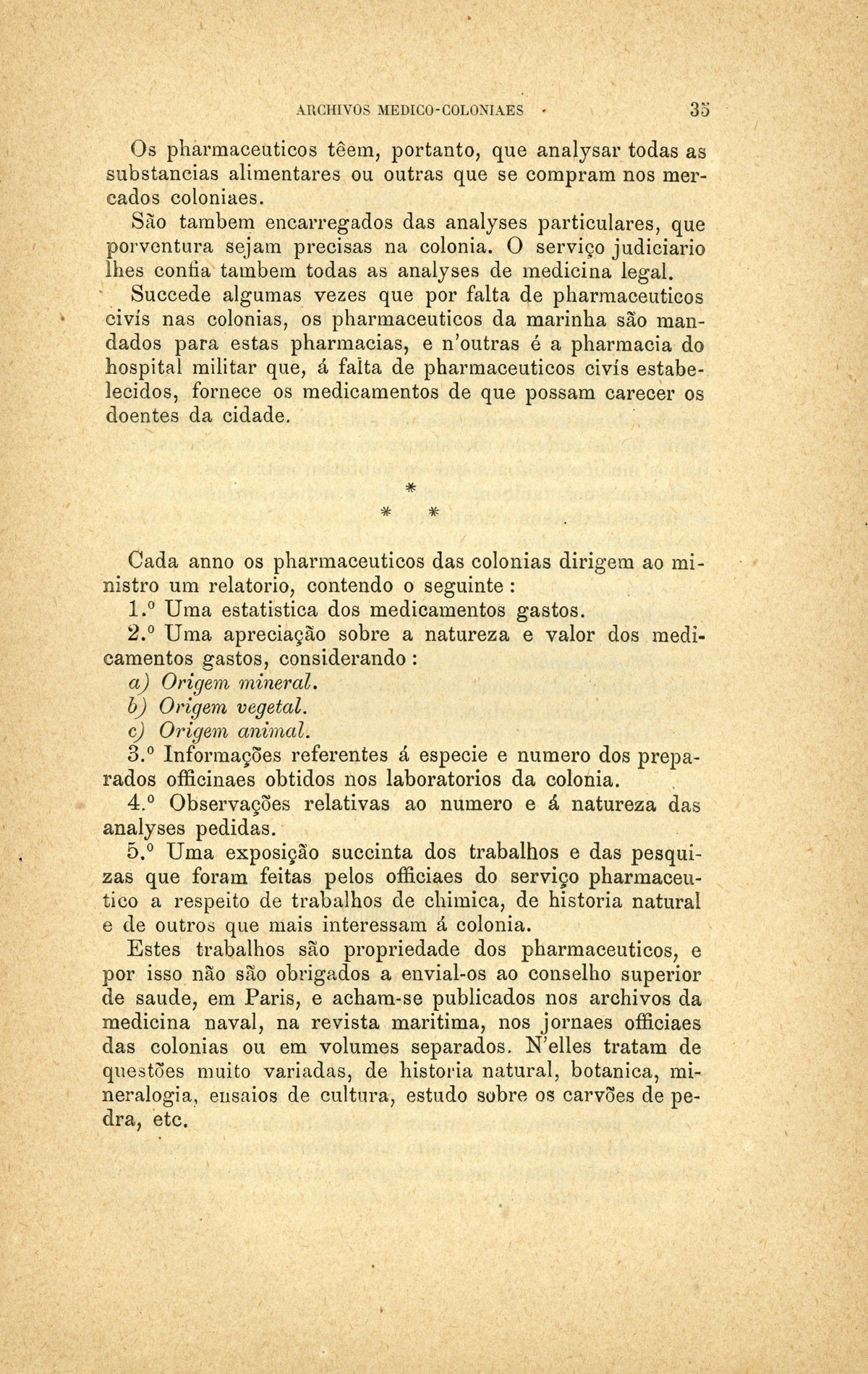 Archivos medico-coloniaes Numero Programma, Março, 1889 capa verso rosto Serviço de saude na Secretaria dos Negocios da Marinha e Ultramar Trabalhos que os facultativos do ultramar devem remetter para a secretaria de estado dos negocios de marinha e ultramar, segundo as disposições do decreto de 2 de dezembro de 1869 Principios fundamentaes, a que se deve attender no estudo dos climas, da emigração e da aclimação nas nossas possessões d'além-mar As grandes luctas da sciencia e da natureza nas terras da África Central Conclusões - sobre a aclimação - approvadas pelo congresso de hygiene e de demographia em Vienna d'Áustria Conclusões - sobre a mal'aria - approvadas pelo congresso de hygiene e de demographia em Vienna d'Áustria; Determinação da área geographica habitada por toda a familia portugueza nos fins do seculo XIX A anthropometria colonial Anthropometria militar A anthropometria policial Classificação geral das possessões portuguezas sob o ponto de vista da imigração e das relações dos indigenas com os europeus Hospital Maria Pia : Nota dos facultativos, sua graduação e concelhos onde se acham em commissão Relatorio do serviço de saude da provincia de Macau e Timor em relação ao anno de 1886, por José Gomes da Silva Caracter pratico e experimental dos trabalhos medico-coloniaes que se devem apresentar Necessidades do serviço de saude em cada uma das nossas provincias do ultramar Reforma da estatistica medica dos hospitaes do ultramar Material scientifico que mais importa obter para se resolverem as principaes questões medico-coloniaes Publicações feitas nas differentes provincias do ultramar; Aos medicos da armada real portugueza Merecidas distincções verso Summario | Numero Programma, Março, 1889 > Trabalhos medico-coloniaes em França > 0035 |