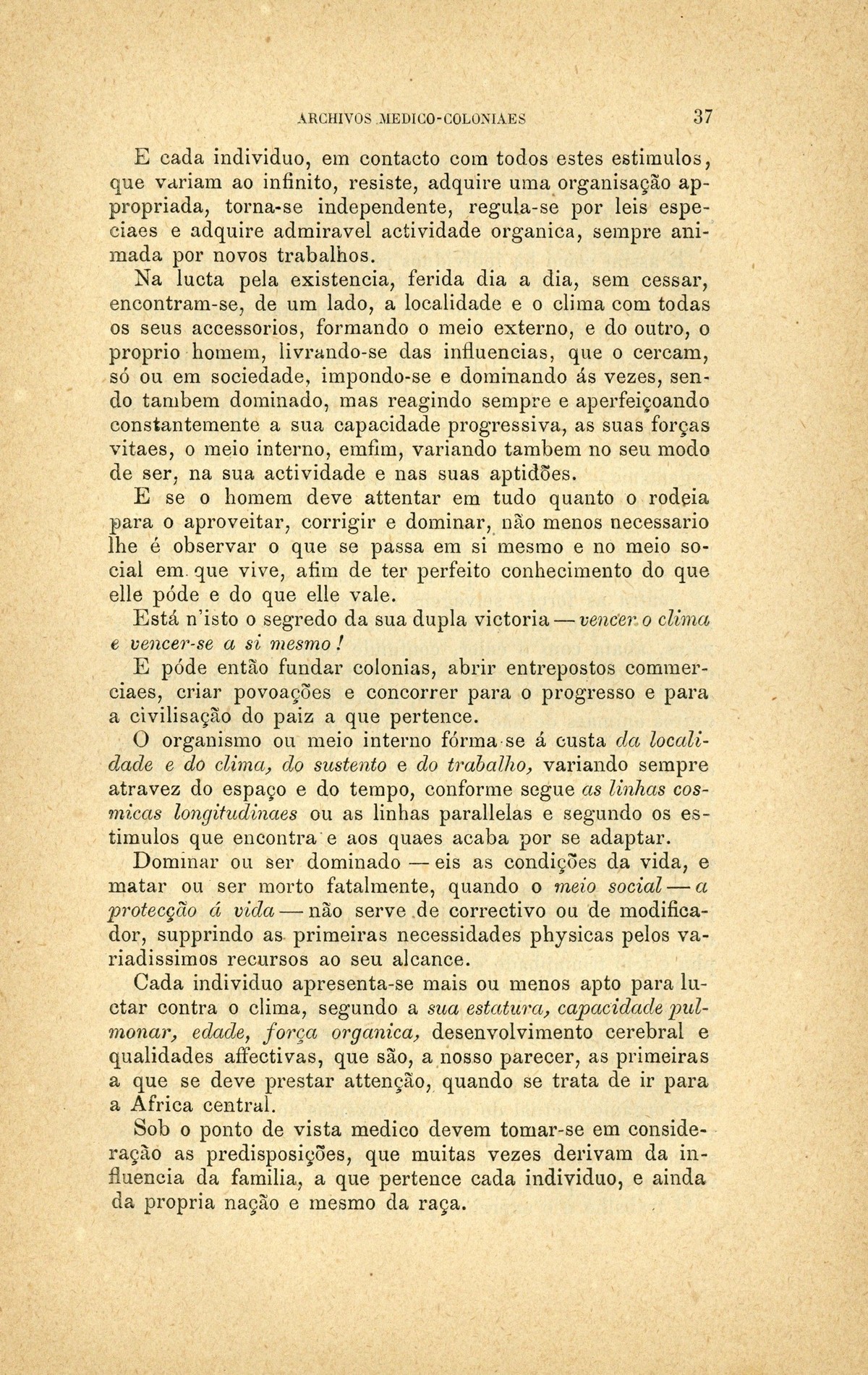 Archivos medico-coloniaes Numero Programma, Março, 1889 capa verso rosto Serviço de saude na Secretaria dos Negocios da Marinha e Ultramar Trabalhos que os facultativos do ultramar devem remetter para a secretaria de estado dos negocios de marinha e ultramar, segundo as disposições do decreto de 2 de dezembro de 1869 Principios fundamentaes, a que se deve attender no estudo dos climas, da emigração e da aclimação nas nossas possessões d'além-mar As grandes luctas da sciencia e da natureza nas terras da África Central Conclusões - sobre a aclimação - approvadas pelo congresso de hygiene e de demographia em Vienna d'Áustria Conclusões - sobre a mal'aria - approvadas pelo congresso de hygiene e de demographia em Vienna d'Áustria; Determinação da área geographica habitada por toda a familia portugueza nos fins do seculo XIX A anthropometria colonial Anthropometria militar A anthropometria policial Classificação geral das possessões portuguezas sob o ponto de vista da imigração e das relações dos indigenas com os europeus Hospital Maria Pia : Nota dos facultativos, sua graduação e concelhos onde se acham em commissão Relatorio do serviço de saude da provincia de Macau e Timor em relação ao anno de 1886, por José Gomes da Silva Caracter pratico e experimental dos trabalhos medico-coloniaes que se devem apresentar Necessidades do serviço de saude em cada uma das nossas provincias do ultramar Reforma da estatistica medica dos hospitaes do ultramar Material scientifico que mais importa obter para se resolverem as principaes questões medico-coloniaes Publicações feitas nas differentes provincias do ultramar; Aos medicos da armada real portugueza Merecidas distincções verso Summario | Numero Programma, Março, 1889 > As grandes luctas da sciencia e da natureza nas terras da África Central > 0037 |