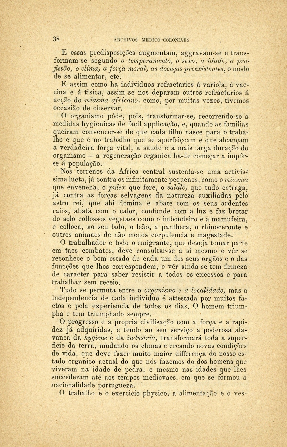 Archivos medico-coloniaes Numero Programma, Março, 1889 capa verso rosto Serviço de saude na Secretaria dos Negocios da Marinha e Ultramar Trabalhos que os facultativos do ultramar devem remetter para a secretaria de estado dos negocios de marinha e ultramar, segundo as disposições do decreto de 2 de dezembro de 1869 Principios fundamentaes, a que se deve attender no estudo dos climas, da emigração e da aclimação nas nossas possessões d'além-mar As grandes luctas da sciencia e da natureza nas terras da África Central Conclusões - sobre a aclimação - approvadas pelo congresso de hygiene e de demographia em Vienna d'Áustria Conclusões - sobre a mal'aria - approvadas pelo congresso de hygiene e de demographia em Vienna d'Áustria; Determinação da área geographica habitada por toda a familia portugueza nos fins do seculo XIX A anthropometria colonial Anthropometria militar A anthropometria policial Classificação geral das possessões portuguezas sob o ponto de vista da imigração e das relações dos indigenas com os europeus Hospital Maria Pia : Nota dos facultativos, sua graduação e concelhos onde se acham em commissão Relatorio do serviço de saude da provincia de Macau e Timor em relação ao anno de 1886, por José Gomes da Silva Caracter pratico e experimental dos trabalhos medico-coloniaes que se devem apresentar Necessidades do serviço de saude em cada uma das nossas provincias do ultramar Reforma da estatistica medica dos hospitaes do ultramar Material scientifico que mais importa obter para se resolverem as principaes questões medico-coloniaes Publicações feitas nas differentes provincias do ultramar; Aos medicos da armada real portugueza Merecidas distincções verso Summario | Numero Programma, Março, 1889 > As grandes luctas da sciencia e da natureza nas terras da África Central > 0038 |