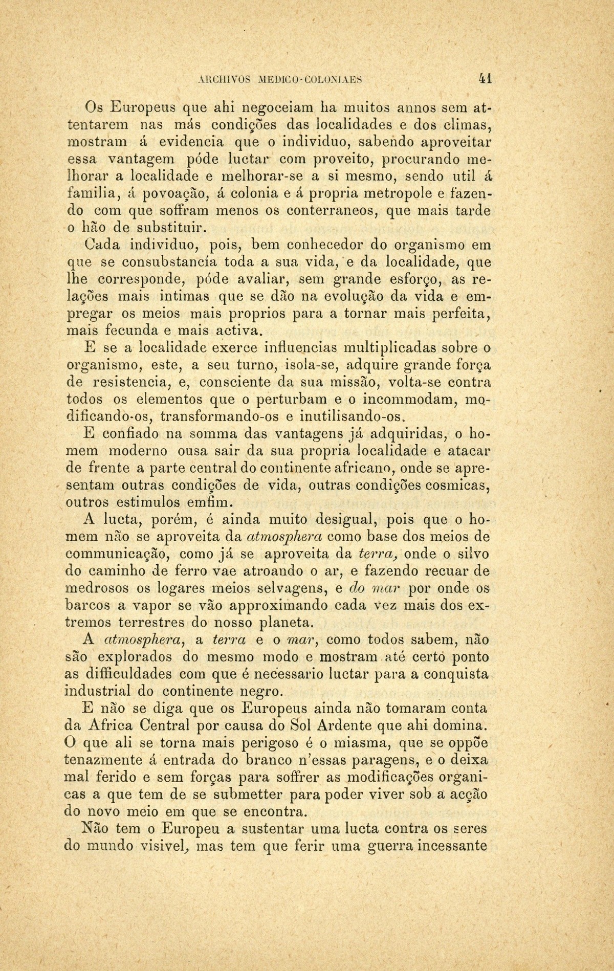 Archivos medico-coloniaes Numero Programma, Março, 1889 capa verso rosto Serviço de saude na Secretaria dos Negocios da Marinha e Ultramar Trabalhos que os facultativos do ultramar devem remetter para a secretaria de estado dos negocios de marinha e ultramar, segundo as disposições do decreto de 2 de dezembro de 1869 Principios fundamentaes, a que se deve attender no estudo dos climas, da emigração e da aclimação nas nossas possessões d'além-mar As grandes luctas da sciencia e da natureza nas terras da África Central Conclusões - sobre a aclimação - approvadas pelo congresso de hygiene e de demographia em Vienna d'Áustria Conclusões - sobre a mal'aria - approvadas pelo congresso de hygiene e de demographia em Vienna d'Áustria; Determinação da área geographica habitada por toda a familia portugueza nos fins do seculo XIX A anthropometria colonial Anthropometria militar A anthropometria policial Classificação geral das possessões portuguezas sob o ponto de vista da imigração e das relações dos indigenas com os europeus Hospital Maria Pia : Nota dos facultativos, sua graduação e concelhos onde se acham em commissão Relatorio do serviço de saude da provincia de Macau e Timor em relação ao anno de 1886, por José Gomes da Silva Caracter pratico e experimental dos trabalhos medico-coloniaes que se devem apresentar Necessidades do serviço de saude em cada uma das nossas provincias do ultramar Reforma da estatistica medica dos hospitaes do ultramar Material scientifico que mais importa obter para se resolverem as principaes questões medico-coloniaes Publicações feitas nas differentes provincias do ultramar; Aos medicos da armada real portugueza Merecidas distincções verso Summario | Numero Programma, Março, 1889 > As grandes luctas da sciencia e da natureza nas terras da África Central > 0041 |
