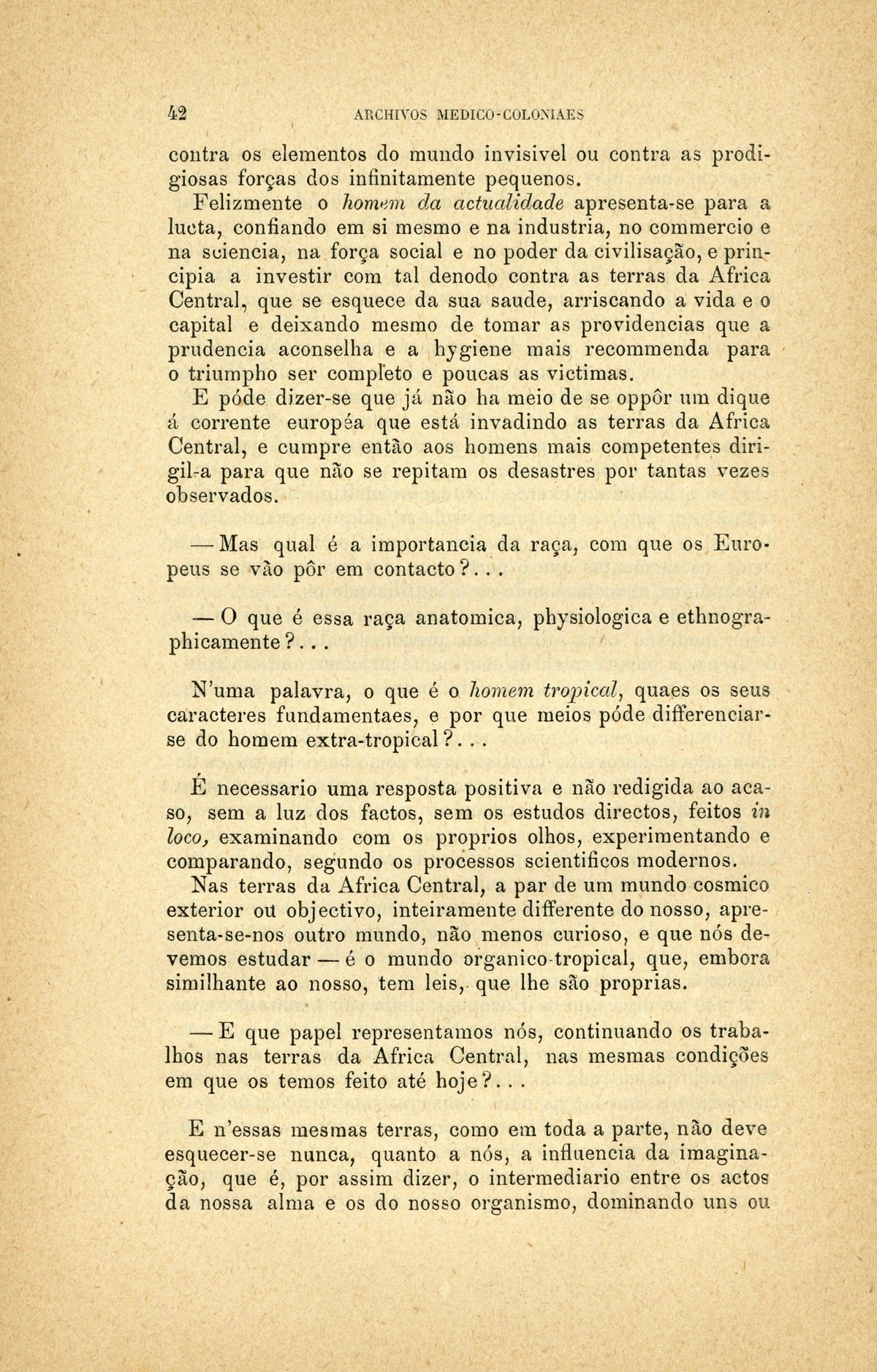 Archivos medico-coloniaes Numero Programma, Março, 1889 capa verso rosto Serviço de saude na Secretaria dos Negocios da Marinha e Ultramar Trabalhos que os facultativos do ultramar devem remetter para a secretaria de estado dos negocios de marinha e ultramar, segundo as disposições do decreto de 2 de dezembro de 1869 Principios fundamentaes, a que se deve attender no estudo dos climas, da emigração e da aclimação nas nossas possessões d'além-mar As grandes luctas da sciencia e da natureza nas terras da África Central Conclusões - sobre a aclimação - approvadas pelo congresso de hygiene e de demographia em Vienna d'Áustria Conclusões - sobre a mal'aria - approvadas pelo congresso de hygiene e de demographia em Vienna d'Áustria; Determinação da área geographica habitada por toda a familia portugueza nos fins do seculo XIX A anthropometria colonial Anthropometria militar A anthropometria policial Classificação geral das possessões portuguezas sob o ponto de vista da imigração e das relações dos indigenas com os europeus Hospital Maria Pia : Nota dos facultativos, sua graduação e concelhos onde se acham em commissão Relatorio do serviço de saude da provincia de Macau e Timor em relação ao anno de 1886, por José Gomes da Silva Caracter pratico e experimental dos trabalhos medico-coloniaes que se devem apresentar Necessidades do serviço de saude em cada uma das nossas provincias do ultramar Reforma da estatistica medica dos hospitaes do ultramar Material scientifico que mais importa obter para se resolverem as principaes questões medico-coloniaes Publicações feitas nas differentes provincias do ultramar; Aos medicos da armada real portugueza Merecidas distincções verso Summario | Numero Programma, Março, 1889 > As grandes luctas da sciencia e da natureza nas terras da África Central > 0042 |
