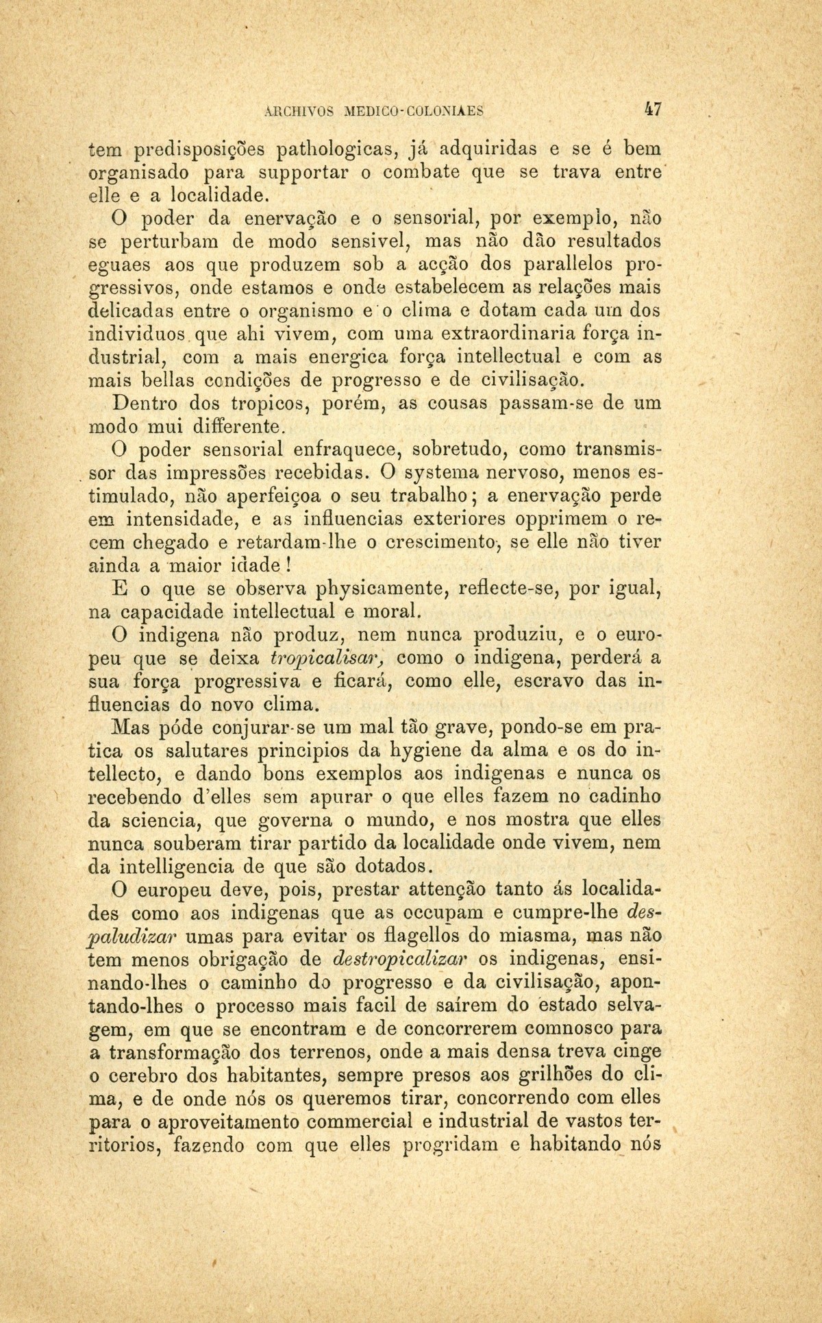 Archivos medico-coloniaes Numero Programma, Março, 1889 capa verso rosto Serviço de saude na Secretaria dos Negocios da Marinha e Ultramar Trabalhos que os facultativos do ultramar devem remetter para a secretaria de estado dos negocios de marinha e ultramar, segundo as disposições do decreto de 2 de dezembro de 1869 Principios fundamentaes, a que se deve attender no estudo dos climas, da emigração e da aclimação nas nossas possessões d'além-mar As grandes luctas da sciencia e da natureza nas terras da África Central Conclusões - sobre a aclimação - approvadas pelo congresso de hygiene e de demographia em Vienna d'Áustria Conclusões - sobre a mal'aria - approvadas pelo congresso de hygiene e de demographia em Vienna d'Áustria; Determinação da área geographica habitada por toda a familia portugueza nos fins do seculo XIX A anthropometria colonial Anthropometria militar A anthropometria policial Classificação geral das possessões portuguezas sob o ponto de vista da imigração e das relações dos indigenas com os europeus Hospital Maria Pia : Nota dos facultativos, sua graduação e concelhos onde se acham em commissão Relatorio do serviço de saude da provincia de Macau e Timor em relação ao anno de 1886, por José Gomes da Silva Caracter pratico e experimental dos trabalhos medico-coloniaes que se devem apresentar Necessidades do serviço de saude em cada uma das nossas provincias do ultramar Reforma da estatistica medica dos hospitaes do ultramar Material scientifico que mais importa obter para se resolverem as principaes questões medico-coloniaes Publicações feitas nas differentes provincias do ultramar; Aos medicos da armada real portugueza Merecidas distincções verso Summario | Numero Programma, Março, 1889 > As grandes luctas da sciencia e da natureza nas terras da África Central > 0047 |