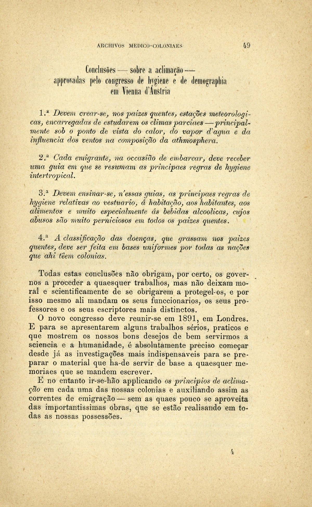 Archivos medico-coloniaes Numero Programma, Março, 1889 capa verso rosto Serviço de saude na Secretaria dos Negocios da Marinha e Ultramar Trabalhos que os facultativos do ultramar devem remetter para a secretaria de estado dos negocios de marinha e ultramar, segundo as disposições do decreto de 2 de dezembro de 1869 Principios fundamentaes, a que se deve attender no estudo dos climas, da emigração e da aclimação nas nossas possessões d'além-mar As grandes luctas da sciencia e da natureza nas terras da África Central Conclusões - sobre a aclimação - approvadas pelo congresso de hygiene e de demographia em Vienna d'Áustria Conclusões - sobre a mal'aria - approvadas pelo congresso de hygiene e de demographia em Vienna d'Áustria; Determinação da área geographica habitada por toda a familia portugueza nos fins do seculo XIX A anthropometria colonial Anthropometria militar A anthropometria policial Classificação geral das possessões portuguezas sob o ponto de vista da imigração e das relações dos indigenas com os europeus Hospital Maria Pia : Nota dos facultativos, sua graduação e concelhos onde se acham em commissão Relatorio do serviço de saude da provincia de Macau e Timor em relação ao anno de 1886, por José Gomes da Silva Caracter pratico e experimental dos trabalhos medico-coloniaes que se devem apresentar Necessidades do serviço de saude em cada uma das nossas provincias do ultramar Reforma da estatistica medica dos hospitaes do ultramar Material scientifico que mais importa obter para se resolverem as principaes questões medico-coloniaes Publicações feitas nas differentes provincias do ultramar; Aos medicos da armada real portugueza Merecidas distincções verso Summario | Numero Programma, Março, 1889 > Conclusões - sobre a aclimação - approvadas pelo congresso de hygiene e de demographia em Vienna d'Áustria > 0049 |