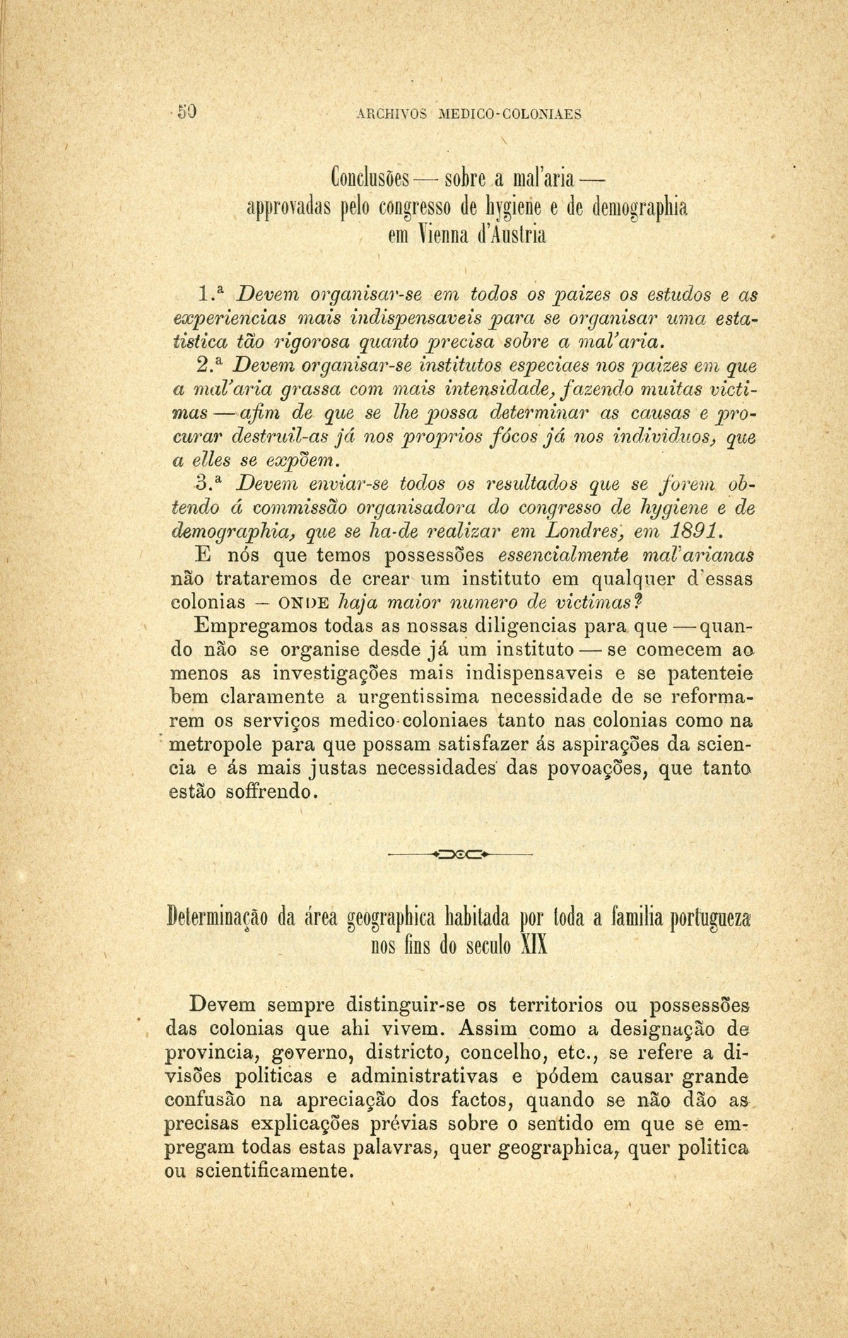Archivos medico-coloniaes Numero Programma, Março, 1889 capa verso rosto Serviço de saude na Secretaria dos Negocios da Marinha e Ultramar Trabalhos que os facultativos do ultramar devem remetter para a secretaria de estado dos negocios de marinha e ultramar, segundo as disposições do decreto de 2 de dezembro de 1869 Principios fundamentaes, a que se deve attender no estudo dos climas, da emigração e da aclimação nas nossas possessões d'além-mar As grandes luctas da sciencia e da natureza nas terras da África Central Conclusões - sobre a aclimação - approvadas pelo congresso de hygiene e de demographia em Vienna d'Áustria Conclusões - sobre a mal'aria - approvadas pelo congresso de hygiene e de demographia em Vienna d'Áustria; Determinação da área geographica habitada por toda a familia portugueza nos fins do seculo XIX A anthropometria colonial Anthropometria militar A anthropometria policial Classificação geral das possessões portuguezas sob o ponto de vista da imigração e das relações dos indigenas com os europeus Hospital Maria Pia : Nota dos facultativos, sua graduação e concelhos onde se acham em commissão Relatorio do serviço de saude da provincia de Macau e Timor em relação ao anno de 1886, por José Gomes da Silva Caracter pratico e experimental dos trabalhos medico-coloniaes que se devem apresentar Necessidades do serviço de saude em cada uma das nossas provincias do ultramar Reforma da estatistica medica dos hospitaes do ultramar Material scientifico que mais importa obter para se resolverem as principaes questões medico-coloniaes Publicações feitas nas differentes provincias do ultramar; Aos medicos da armada real portugueza Merecidas distincções verso Summario | Numero Programma, Março, 1889 > Conclusões - sobre a mal'aria - approvadas pelo congresso de hygiene e de demographia em Vienna d'Áustria; Determinação da área geographica habitada por toda a familia portugueza nos fins do seculo XIX > 0050 |