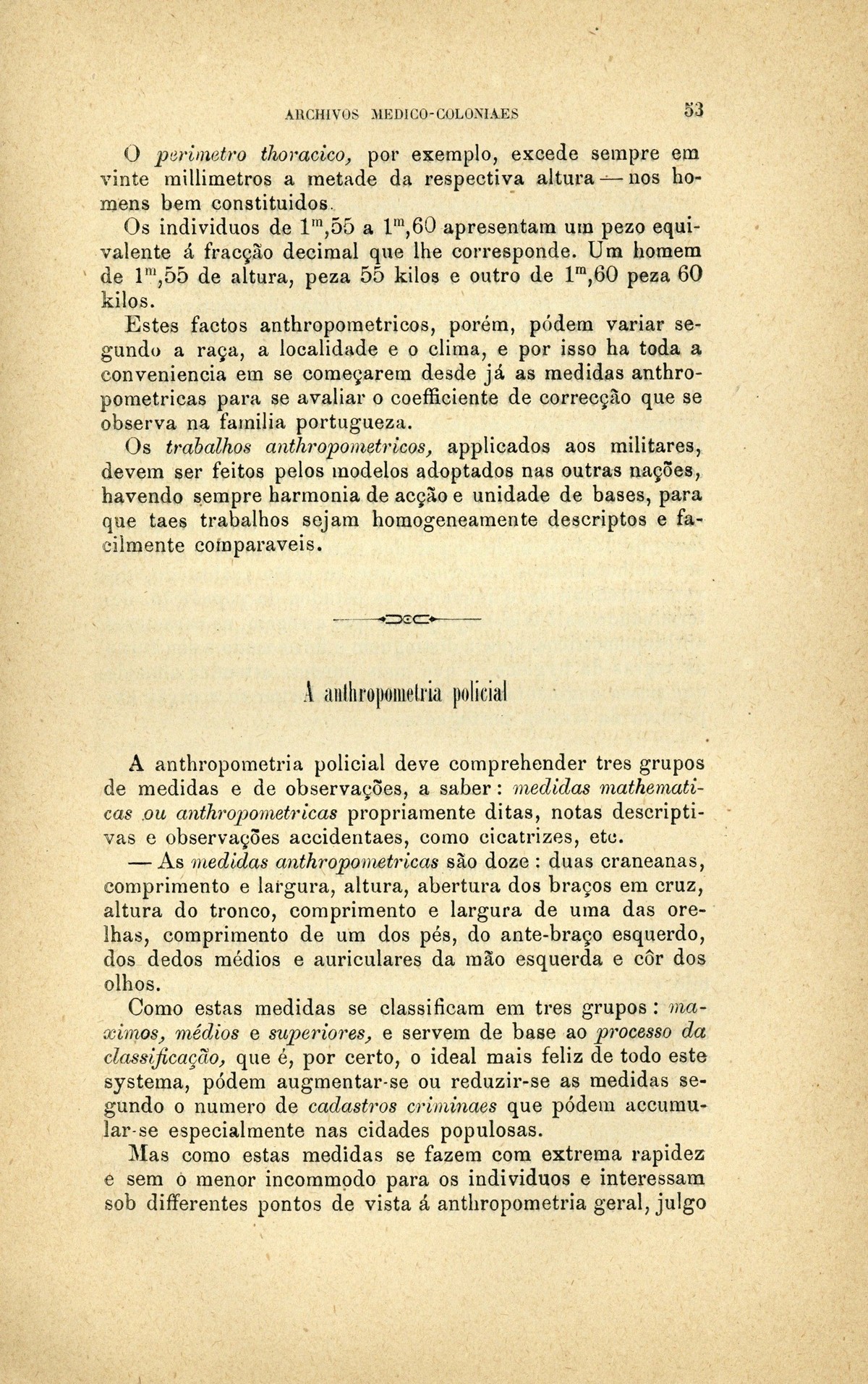 Archivos medico-coloniaes Numero Programma, Março, 1889 capa verso rosto Serviço de saude na Secretaria dos Negocios da Marinha e Ultramar Trabalhos que os facultativos do ultramar devem remetter para a secretaria de estado dos negocios de marinha e ultramar, segundo as disposições do decreto de 2 de dezembro de 1869 Principios fundamentaes, a que se deve attender no estudo dos climas, da emigração e da aclimação nas nossas possessões d'além-mar As grandes luctas da sciencia e da natureza nas terras da África Central Conclusões - sobre a aclimação - approvadas pelo congresso de hygiene e de demographia em Vienna d'Áustria Conclusões - sobre a mal'aria - approvadas pelo congresso de hygiene e de demographia em Vienna d'Áustria; Determinação da área geographica habitada por toda a familia portugueza nos fins do seculo XIX A anthropometria colonial Anthropometria militar A anthropometria policial Classificação geral das possessões portuguezas sob o ponto de vista da imigração e das relações dos indigenas com os europeus Hospital Maria Pia : Nota dos facultativos, sua graduação e concelhos onde se acham em commissão Relatorio do serviço de saude da provincia de Macau e Timor em relação ao anno de 1886, por José Gomes da Silva Caracter pratico e experimental dos trabalhos medico-coloniaes que se devem apresentar Necessidades do serviço de saude em cada uma das nossas provincias do ultramar Reforma da estatistica medica dos hospitaes do ultramar Material scientifico que mais importa obter para se resolverem as principaes questões medico-coloniaes Publicações feitas nas differentes provincias do ultramar; Aos medicos da armada real portugueza Merecidas distincções verso Summario | Numero Programma, Março, 1889 > A anthropometria policial > 0053 |