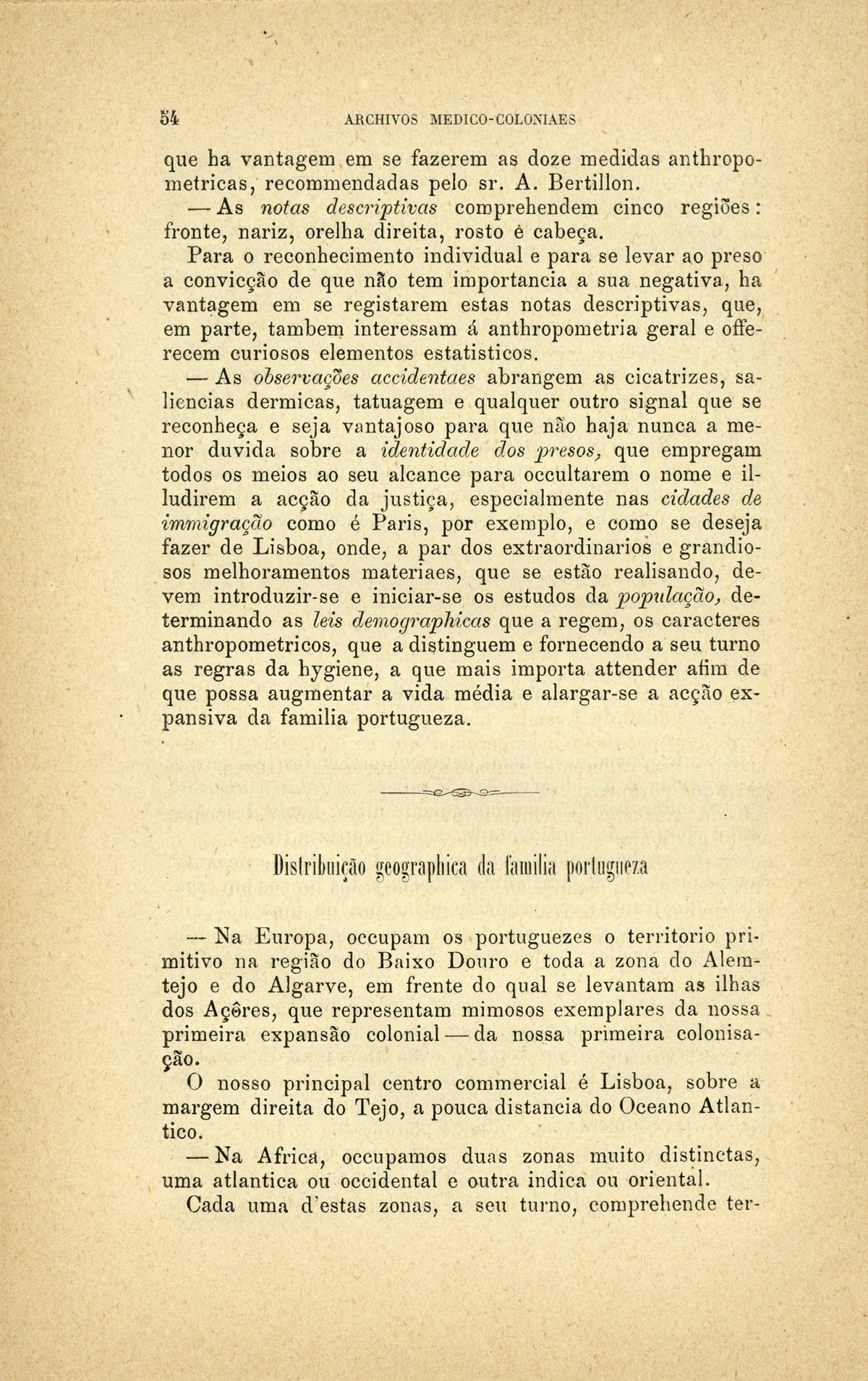 Archivos medico-coloniaes Numero Programma, Março, 1889 capa verso rosto Serviço de saude na Secretaria dos Negocios da Marinha e Ultramar Trabalhos que os facultativos do ultramar devem remetter para a secretaria de estado dos negocios de marinha e ultramar, segundo as disposições do decreto de 2 de dezembro de 1869 Principios fundamentaes, a que se deve attender no estudo dos climas, da emigração e da aclimação nas nossas possessões d'além-mar As grandes luctas da sciencia e da natureza nas terras da África Central Conclusões - sobre a aclimação - approvadas pelo congresso de hygiene e de demographia em Vienna d'Áustria Conclusões - sobre a mal'aria - approvadas pelo congresso de hygiene e de demographia em Vienna d'Áustria; Determinação da área geographica habitada por toda a familia portugueza nos fins do seculo XIX A anthropometria colonial Anthropometria militar A anthropometria policial Classificação geral das possessões portuguezas sob o ponto de vista da imigração e das relações dos indigenas com os europeus Hospital Maria Pia : Nota dos facultativos, sua graduação e concelhos onde se acham em commissão Relatorio do serviço de saude da provincia de Macau e Timor em relação ao anno de 1886, por José Gomes da Silva Caracter pratico e experimental dos trabalhos medico-coloniaes que se devem apresentar Necessidades do serviço de saude em cada uma das nossas provincias do ultramar Reforma da estatistica medica dos hospitaes do ultramar Material scientifico que mais importa obter para se resolverem as principaes questões medico-coloniaes Publicações feitas nas differentes provincias do ultramar; Aos medicos da armada real portugueza Merecidas distincções verso Summario | Numero Programma, Março, 1889 > Distribuição geographica da familia portugueza > 0054 |
