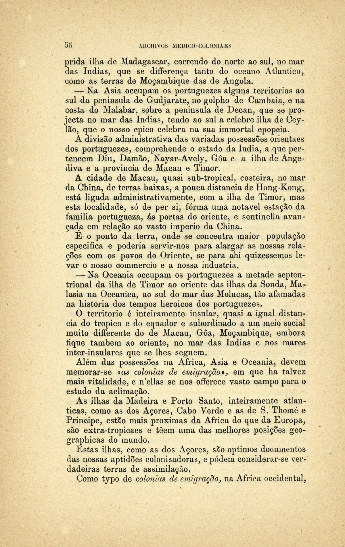 Archivos medico-coloniaes Numero Programma, Março, 1889 capa verso rosto Serviço de saude na Secretaria dos Negocios da Marinha e Ultramar Trabalhos que os facultativos do ultramar devem remetter para a secretaria de estado dos negocios de marinha e ultramar, segundo as disposições do decreto de 2 de dezembro de 1869 Principios fundamentaes, a que se deve attender no estudo dos climas, da emigração e da aclimação nas nossas possessões d'além-mar As grandes luctas da sciencia e da natureza nas terras da África Central Conclusões - sobre a aclimação - approvadas pelo congresso de hygiene e de demographia em Vienna d'Áustria Conclusões - sobre a mal'aria - approvadas pelo congresso de hygiene e de demographia em Vienna d'Áustria; Determinação da área geographica habitada por toda a familia portugueza nos fins do seculo XIX A anthropometria colonial Anthropometria militar A anthropometria policial Classificação geral das possessões portuguezas sob o ponto de vista da imigração e das relações dos indigenas com os europeus Hospital Maria Pia : Nota dos facultativos, sua graduação e concelhos onde se acham em commissão Relatorio do serviço de saude da provincia de Macau e Timor em relação ao anno de 1886, por José Gomes da Silva Caracter pratico e experimental dos trabalhos medico-coloniaes que se devem apresentar Necessidades do serviço de saude em cada uma das nossas provincias do ultramar Reforma da estatistica medica dos hospitaes do ultramar Material scientifico que mais importa obter para se resolverem as principaes questões medico-coloniaes Publicações feitas nas differentes provincias do ultramar; Aos medicos da armada real portugueza Merecidas distincções verso Summario | Numero Programma, Março, 1889 > Distribuição geographica da familia portugueza > 0056 |