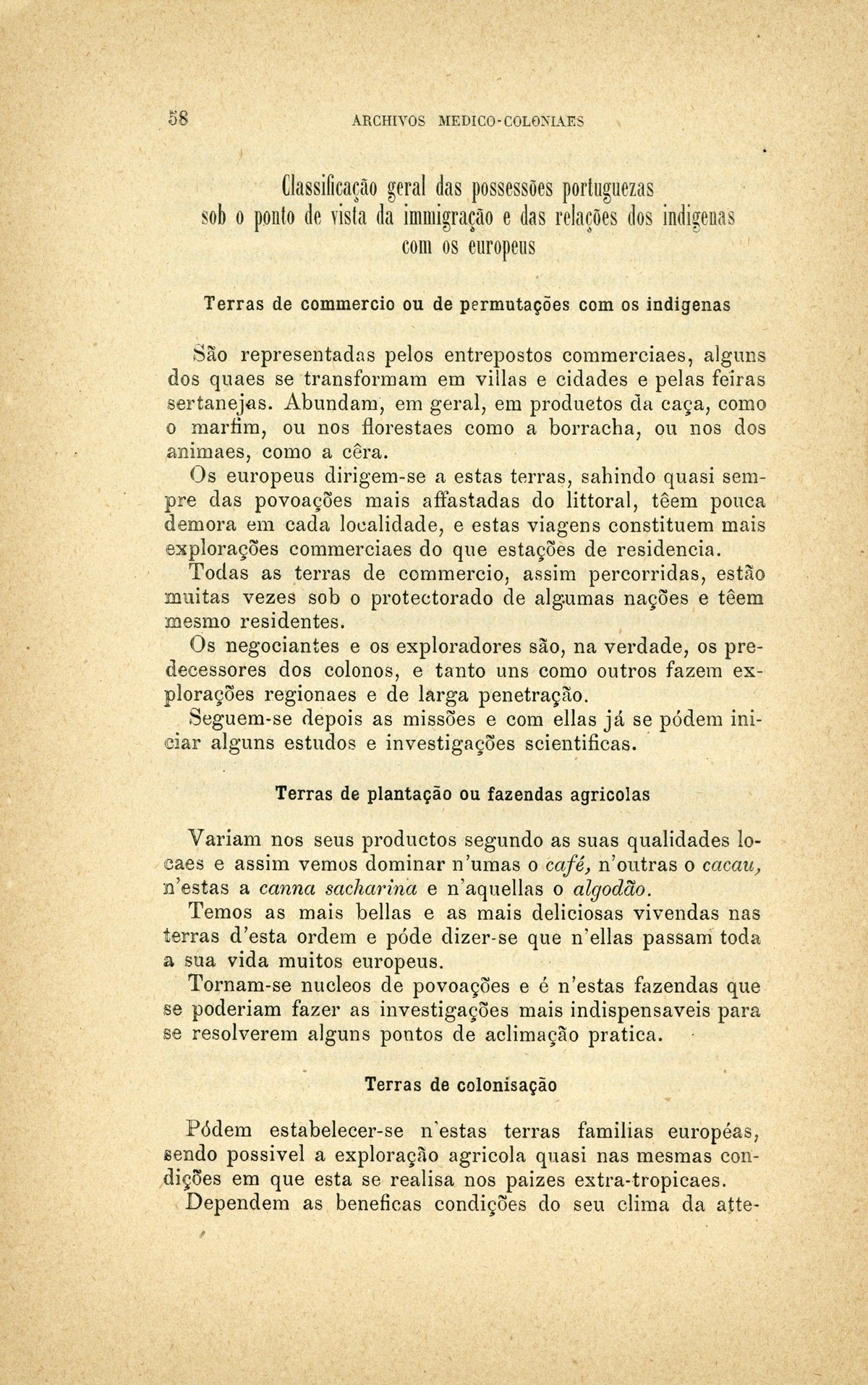 Archivos medico-coloniaes Numero Programma, Março, 1889 capa verso rosto Serviço de saude na Secretaria dos Negocios da Marinha e Ultramar Trabalhos que os facultativos do ultramar devem remetter para a secretaria de estado dos negocios de marinha e ultramar, segundo as disposições do decreto de 2 de dezembro de 1869 Principios fundamentaes, a que se deve attender no estudo dos climas, da emigração e da aclimação nas nossas possessões d'além-mar As grandes luctas da sciencia e da natureza nas terras da África Central Conclusões - sobre a aclimação - approvadas pelo congresso de hygiene e de demographia em Vienna d'Áustria Conclusões - sobre a mal'aria - approvadas pelo congresso de hygiene e de demographia em Vienna d'Áustria; Determinação da área geographica habitada por toda a familia portugueza nos fins do seculo XIX A anthropometria colonial Anthropometria militar A anthropometria policial Classificação geral das possessões portuguezas sob o ponto de vista da imigração e das relações dos indigenas com os europeus Hospital Maria Pia : Nota dos facultativos, sua graduação e concelhos onde se acham em commissão Relatorio do serviço de saude da provincia de Macau e Timor em relação ao anno de 1886, por José Gomes da Silva Caracter pratico e experimental dos trabalhos medico-coloniaes que se devem apresentar Necessidades do serviço de saude em cada uma das nossas provincias do ultramar Reforma da estatistica medica dos hospitaes do ultramar Material scientifico que mais importa obter para se resolverem as principaes questões medico-coloniaes Publicações feitas nas differentes provincias do ultramar; Aos medicos da armada real portugueza Merecidas distincções verso Summario | Numero Programma, Março, 1889 > Classificação geral das possessões portuguezas sob o ponto de vista da imigração e das relações dos indigenas com os europeus > 0058 |