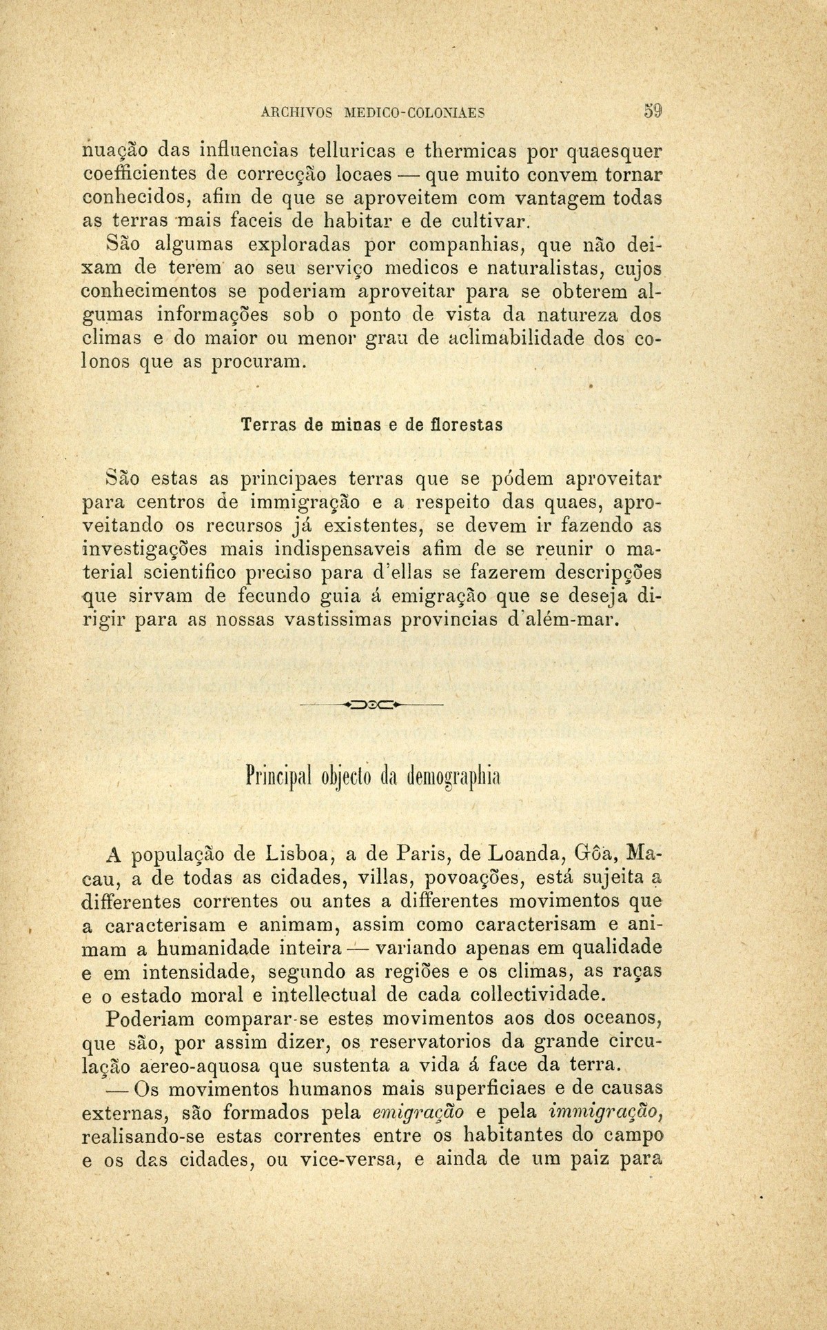 Archivos medico-coloniaes Numero Programma, Março, 1889 capa verso rosto Serviço de saude na Secretaria dos Negocios da Marinha e Ultramar Trabalhos que os facultativos do ultramar devem remetter para a secretaria de estado dos negocios de marinha e ultramar, segundo as disposições do decreto de 2 de dezembro de 1869 Principios fundamentaes, a que se deve attender no estudo dos climas, da emigração e da aclimação nas nossas possessões d'além-mar As grandes luctas da sciencia e da natureza nas terras da África Central Conclusões - sobre a aclimação - approvadas pelo congresso de hygiene e de demographia em Vienna d'Áustria Conclusões - sobre a mal'aria - approvadas pelo congresso de hygiene e de demographia em Vienna d'Áustria; Determinação da área geographica habitada por toda a familia portugueza nos fins do seculo XIX A anthropometria colonial Anthropometria militar A anthropometria policial Classificação geral das possessões portuguezas sob o ponto de vista da imigração e das relações dos indigenas com os europeus Hospital Maria Pia : Nota dos facultativos, sua graduação e concelhos onde se acham em commissão Relatorio do serviço de saude da provincia de Macau e Timor em relação ao anno de 1886, por José Gomes da Silva Caracter pratico e experimental dos trabalhos medico-coloniaes que se devem apresentar Necessidades do serviço de saude em cada uma das nossas provincias do ultramar Reforma da estatistica medica dos hospitaes do ultramar Material scientifico que mais importa obter para se resolverem as principaes questões medico-coloniaes Publicações feitas nas differentes provincias do ultramar; Aos medicos da armada real portugueza Merecidas distincções verso Summario | Numero Programma, Março, 1889 > Principal objecto da demographia > 0059 |