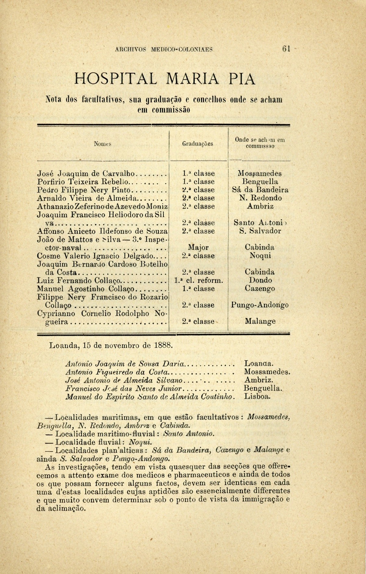 Archivos medico-coloniaes Numero Programma, Março, 1889 capa verso rosto Serviço de saude na Secretaria dos Negocios da Marinha e Ultramar Trabalhos que os facultativos do ultramar devem remetter para a secretaria de estado dos negocios de marinha e ultramar, segundo as disposições do decreto de 2 de dezembro de 1869 Principios fundamentaes, a que se deve attender no estudo dos climas, da emigração e da aclimação nas nossas possessões d'além-mar As grandes luctas da sciencia e da natureza nas terras da África Central Conclusões - sobre a aclimação - approvadas pelo congresso de hygiene e de demographia em Vienna d'Áustria Conclusões - sobre a mal'aria - approvadas pelo congresso de hygiene e de demographia em Vienna d'Áustria; Determinação da área geographica habitada por toda a familia portugueza nos fins do seculo XIX A anthropometria colonial Anthropometria militar A anthropometria policial Classificação geral das possessões portuguezas sob o ponto de vista da imigração e das relações dos indigenas com os europeus Hospital Maria Pia : Nota dos facultativos, sua graduação e concelhos onde se acham em commissão Relatorio do serviço de saude da provincia de Macau e Timor em relação ao anno de 1886, por José Gomes da Silva Caracter pratico e experimental dos trabalhos medico-coloniaes que se devem apresentar Necessidades do serviço de saude em cada uma das nossas provincias do ultramar Reforma da estatistica medica dos hospitaes do ultramar Material scientifico que mais importa obter para se resolverem as principaes questões medico-coloniaes Publicações feitas nas differentes provincias do ultramar; Aos medicos da armada real portugueza Merecidas distincções verso Summario | Numero Programma, Março, 1889 > Hospital Maria Pia : Nota dos facultativos, sua graduação e concelhos onde se acham em commissão > 0061 |