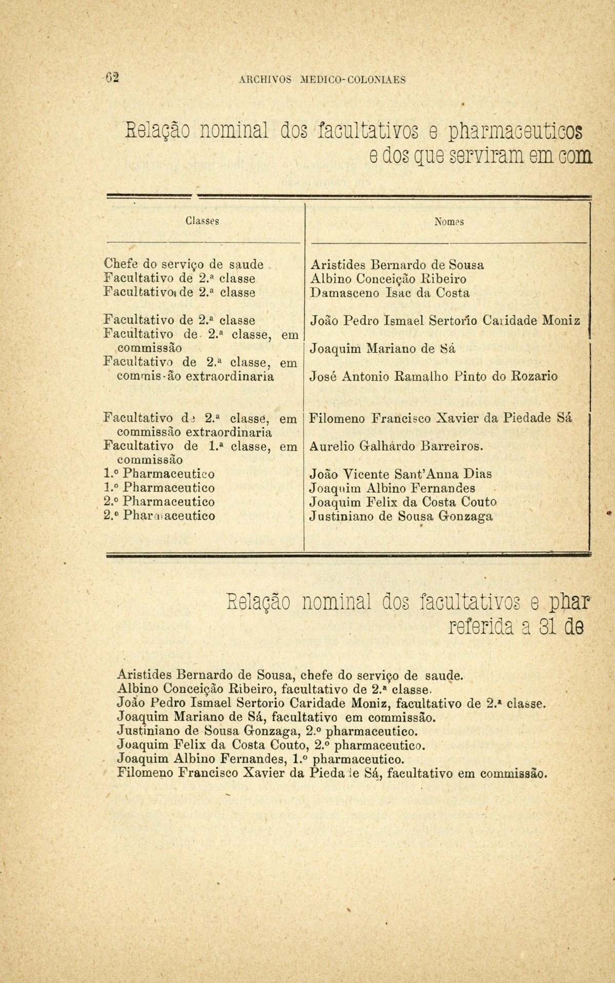 Archivos medico-coloniaes Numero Programma, Março, 1889 capa verso rosto Serviço de saude na Secretaria dos Negocios da Marinha e Ultramar Trabalhos que os facultativos do ultramar devem remetter para a secretaria de estado dos negocios de marinha e ultramar, segundo as disposições do decreto de 2 de dezembro de 1869 Principios fundamentaes, a que se deve attender no estudo dos climas, da emigração e da aclimação nas nossas possessões d'além-mar As grandes luctas da sciencia e da natureza nas terras da África Central Conclusões - sobre a aclimação - approvadas pelo congresso de hygiene e de demographia em Vienna d'Áustria Conclusões - sobre a mal'aria - approvadas pelo congresso de hygiene e de demographia em Vienna d'Áustria; Determinação da área geographica habitada por toda a familia portugueza nos fins do seculo XIX A anthropometria colonial Anthropometria militar A anthropometria policial Classificação geral das possessões portuguezas sob o ponto de vista da imigração e das relações dos indigenas com os europeus Hospital Maria Pia : Nota dos facultativos, sua graduação e concelhos onde se acham em commissão Relatorio do serviço de saude da provincia de Macau e Timor em relação ao anno de 1886, por José Gomes da Silva Caracter pratico e experimental dos trabalhos medico-coloniaes que se devem apresentar Necessidades do serviço de saude em cada uma das nossas provincias do ultramar Reforma da estatistica medica dos hospitaes do ultramar Material scientifico que mais importa obter para se resolverem as principaes questões medico-coloniaes Publicações feitas nas differentes provincias do ultramar; Aos medicos da armada real portugueza Merecidas distincções verso Summario | Numero Programma, Março, 1889 > Hospital Maria Pia : Nota dos facultativos, sua graduação e concelhos onde se acham em commissão > 0062 |