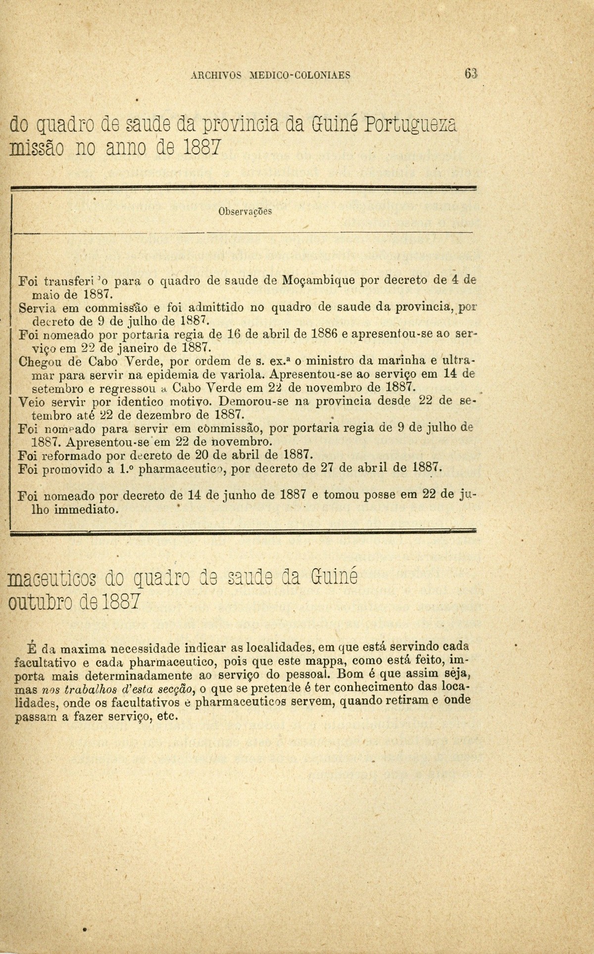 Archivos medico-coloniaes Numero Programma, Março, 1889 capa verso rosto Serviço de saude na Secretaria dos Negocios da Marinha e Ultramar Trabalhos que os facultativos do ultramar devem remetter para a secretaria de estado dos negocios de marinha e ultramar, segundo as disposições do decreto de 2 de dezembro de 1869 Principios fundamentaes, a que se deve attender no estudo dos climas, da emigração e da aclimação nas nossas possessões d'além-mar As grandes luctas da sciencia e da natureza nas terras da África Central Conclusões - sobre a aclimação - approvadas pelo congresso de hygiene e de demographia em Vienna d'Áustria Conclusões - sobre a mal'aria - approvadas pelo congresso de hygiene e de demographia em Vienna d'Áustria; Determinação da área geographica habitada por toda a familia portugueza nos fins do seculo XIX A anthropometria colonial Anthropometria militar A anthropometria policial Classificação geral das possessões portuguezas sob o ponto de vista da imigração e das relações dos indigenas com os europeus Hospital Maria Pia : Nota dos facultativos, sua graduação e concelhos onde se acham em commissão Relatorio do serviço de saude da provincia de Macau e Timor em relação ao anno de 1886, por José Gomes da Silva Caracter pratico e experimental dos trabalhos medico-coloniaes que se devem apresentar Necessidades do serviço de saude em cada uma das nossas provincias do ultramar Reforma da estatistica medica dos hospitaes do ultramar Material scientifico que mais importa obter para se resolverem as principaes questões medico-coloniaes Publicações feitas nas differentes provincias do ultramar; Aos medicos da armada real portugueza Merecidas distincções verso Summario | Numero Programma, Março, 1889 > Hospital Maria Pia : Nota dos facultativos, sua graduação e concelhos onde se acham em commissão > 0063 |