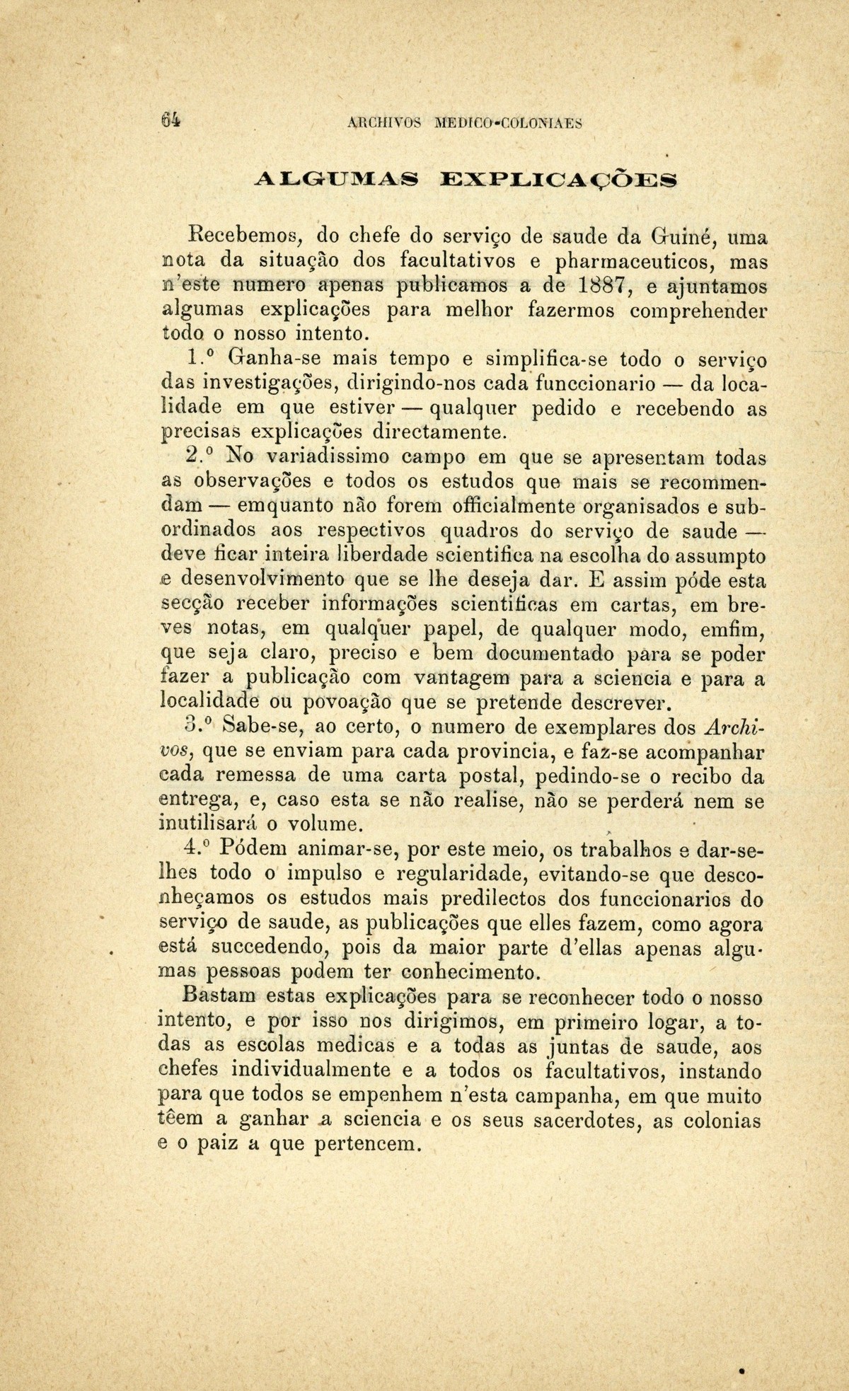 Archivos medico-coloniaes Numero Programma, Março, 1889 capa verso rosto Serviço de saude na Secretaria dos Negocios da Marinha e Ultramar Trabalhos que os facultativos do ultramar devem remetter para a secretaria de estado dos negocios de marinha e ultramar, segundo as disposições do decreto de 2 de dezembro de 1869 Principios fundamentaes, a que se deve attender no estudo dos climas, da emigração e da aclimação nas nossas possessões d'além-mar As grandes luctas da sciencia e da natureza nas terras da África Central Conclusões - sobre a aclimação - approvadas pelo congresso de hygiene e de demographia em Vienna d'Áustria Conclusões - sobre a mal'aria - approvadas pelo congresso de hygiene e de demographia em Vienna d'Áustria; Determinação da área geographica habitada por toda a familia portugueza nos fins do seculo XIX A anthropometria colonial Anthropometria militar A anthropometria policial Classificação geral das possessões portuguezas sob o ponto de vista da imigração e das relações dos indigenas com os europeus Hospital Maria Pia : Nota dos facultativos, sua graduação e concelhos onde se acham em commissão Relatorio do serviço de saude da provincia de Macau e Timor em relação ao anno de 1886, por José Gomes da Silva Caracter pratico e experimental dos trabalhos medico-coloniaes que se devem apresentar Necessidades do serviço de saude em cada uma das nossas provincias do ultramar Reforma da estatistica medica dos hospitaes do ultramar Material scientifico que mais importa obter para se resolverem as principaes questões medico-coloniaes Publicações feitas nas differentes provincias do ultramar; Aos medicos da armada real portugueza Merecidas distincções verso Summario | Numero Programma, Março, 1889 > Hospital Maria Pia : Nota dos facultativos, sua graduação e concelhos onde se acham em commissão > 0064 |