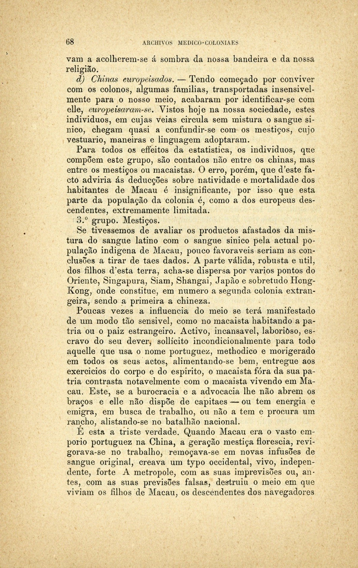 Archivos medico-coloniaes Numero Programma, Março, 1889 capa verso rosto Serviço de saude na Secretaria dos Negocios da Marinha e Ultramar Trabalhos que os facultativos do ultramar devem remetter para a secretaria de estado dos negocios de marinha e ultramar, segundo as disposições do decreto de 2 de dezembro de 1869 Principios fundamentaes, a que se deve attender no estudo dos climas, da emigração e da aclimação nas nossas possessões d'além-mar As grandes luctas da sciencia e da natureza nas terras da África Central Conclusões - sobre a aclimação - approvadas pelo congresso de hygiene e de demographia em Vienna d'Áustria Conclusões - sobre a mal'aria - approvadas pelo congresso de hygiene e de demographia em Vienna d'Áustria; Determinação da área geographica habitada por toda a familia portugueza nos fins do seculo XIX A anthropometria colonial Anthropometria militar A anthropometria policial Classificação geral das possessões portuguezas sob o ponto de vista da imigração e das relações dos indigenas com os europeus Hospital Maria Pia : Nota dos facultativos, sua graduação e concelhos onde se acham em commissão Relatorio do serviço de saude da provincia de Macau e Timor em relação ao anno de 1886, por José Gomes da Silva Caracter pratico e experimental dos trabalhos medico-coloniaes que se devem apresentar Necessidades do serviço de saude em cada uma das nossas provincias do ultramar Reforma da estatistica medica dos hospitaes do ultramar Material scientifico que mais importa obter para se resolverem as principaes questões medico-coloniaes Publicações feitas nas differentes provincias do ultramar; Aos medicos da armada real portugueza Merecidas distincções verso Summario | Numero Programma, Março, 1889 > Relatorio do serviço de saude da provincia de Macau e Timor em relação ao anno de 1886, por José Gomes da Silva > 0068 |