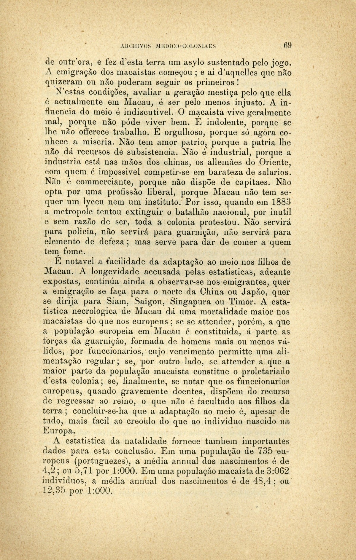 Archivos medico-coloniaes Numero Programma, Março, 1889 capa verso rosto Serviço de saude na Secretaria dos Negocios da Marinha e Ultramar Trabalhos que os facultativos do ultramar devem remetter para a secretaria de estado dos negocios de marinha e ultramar, segundo as disposições do decreto de 2 de dezembro de 1869 Principios fundamentaes, a que se deve attender no estudo dos climas, da emigração e da aclimação nas nossas possessões d'além-mar As grandes luctas da sciencia e da natureza nas terras da África Central Conclusões - sobre a aclimação - approvadas pelo congresso de hygiene e de demographia em Vienna d'Áustria Conclusões - sobre a mal'aria - approvadas pelo congresso de hygiene e de demographia em Vienna d'Áustria; Determinação da área geographica habitada por toda a familia portugueza nos fins do seculo XIX A anthropometria colonial Anthropometria militar A anthropometria policial Classificação geral das possessões portuguezas sob o ponto de vista da imigração e das relações dos indigenas com os europeus Hospital Maria Pia : Nota dos facultativos, sua graduação e concelhos onde se acham em commissão Relatorio do serviço de saude da provincia de Macau e Timor em relação ao anno de 1886, por José Gomes da Silva Caracter pratico e experimental dos trabalhos medico-coloniaes que se devem apresentar Necessidades do serviço de saude em cada uma das nossas provincias do ultramar Reforma da estatistica medica dos hospitaes do ultramar Material scientifico que mais importa obter para se resolverem as principaes questões medico-coloniaes Publicações feitas nas differentes provincias do ultramar; Aos medicos da armada real portugueza Merecidas distincções verso Summario | Numero Programma, Março, 1889 > Relatorio do serviço de saude da provincia de Macau e Timor em relação ao anno de 1886, por José Gomes da Silva > 0069 |