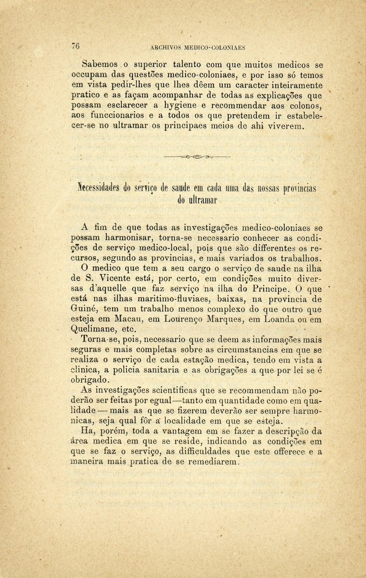 Archivos medico-coloniaes Numero Programma, Março, 1889 capa verso rosto Serviço de saude na Secretaria dos Negocios da Marinha e Ultramar Trabalhos que os facultativos do ultramar devem remetter para a secretaria de estado dos negocios de marinha e ultramar, segundo as disposições do decreto de 2 de dezembro de 1869 Principios fundamentaes, a que se deve attender no estudo dos climas, da emigração e da aclimação nas nossas possessões d'além-mar As grandes luctas da sciencia e da natureza nas terras da África Central Conclusões - sobre a aclimação - approvadas pelo congresso de hygiene e de demographia em Vienna d'Áustria Conclusões - sobre a mal'aria - approvadas pelo congresso de hygiene e de demographia em Vienna d'Áustria; Determinação da área geographica habitada por toda a familia portugueza nos fins do seculo XIX A anthropometria colonial Anthropometria militar A anthropometria policial Classificação geral das possessões portuguezas sob o ponto de vista da imigração e das relações dos indigenas com os europeus Hospital Maria Pia : Nota dos facultativos, sua graduação e concelhos onde se acham em commissão Relatorio do serviço de saude da provincia de Macau e Timor em relação ao anno de 1886, por José Gomes da Silva Caracter pratico e experimental dos trabalhos medico-coloniaes que se devem apresentar Necessidades do serviço de saude em cada uma das nossas provincias do ultramar Reforma da estatistica medica dos hospitaes do ultramar Material scientifico que mais importa obter para se resolverem as principaes questões medico-coloniaes Publicações feitas nas differentes provincias do ultramar; Aos medicos da armada real portugueza Merecidas distincções verso Summario | Numero Programma, Março, 1889 > Necessidades do serviço de saude em cada uma das nossas provincias do ultramar > 0076 |
