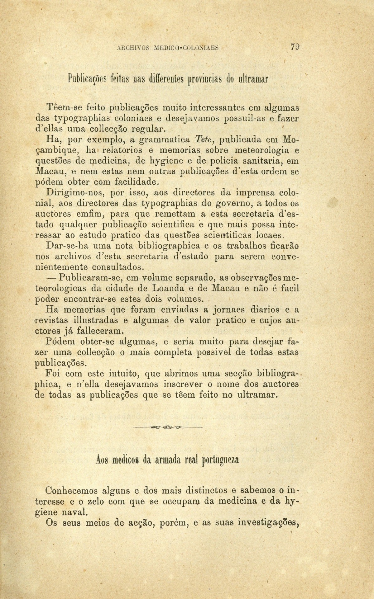 Archivos medico-coloniaes Numero Programma, Março, 1889 capa verso rosto Serviço de saude na Secretaria dos Negocios da Marinha e Ultramar Trabalhos que os facultativos do ultramar devem remetter para a secretaria de estado dos negocios de marinha e ultramar, segundo as disposições do decreto de 2 de dezembro de 1869 Principios fundamentaes, a que se deve attender no estudo dos climas, da emigração e da aclimação nas nossas possessões d'além-mar As grandes luctas da sciencia e da natureza nas terras da África Central Conclusões - sobre a aclimação - approvadas pelo congresso de hygiene e de demographia em Vienna d'Áustria Conclusões - sobre a mal'aria - approvadas pelo congresso de hygiene e de demographia em Vienna d'Áustria; Determinação da área geographica habitada por toda a familia portugueza nos fins do seculo XIX A anthropometria colonial Anthropometria militar A anthropometria policial Classificação geral das possessões portuguezas sob o ponto de vista da imigração e das relações dos indigenas com os europeus Hospital Maria Pia : Nota dos facultativos, sua graduação e concelhos onde se acham em commissão Relatorio do serviço de saude da provincia de Macau e Timor em relação ao anno de 1886, por José Gomes da Silva Caracter pratico e experimental dos trabalhos medico-coloniaes que se devem apresentar Necessidades do serviço de saude em cada uma das nossas provincias do ultramar Reforma da estatistica medica dos hospitaes do ultramar Material scientifico que mais importa obter para se resolverem as principaes questões medico-coloniaes Publicações feitas nas differentes provincias do ultramar; Aos medicos da armada real portugueza Merecidas distincções verso Summario | Numero Programma, Março, 1889 > Publicações feitas nas differentes provincias do ultramar; Aos medicos da armada real portugueza > 0079 |
