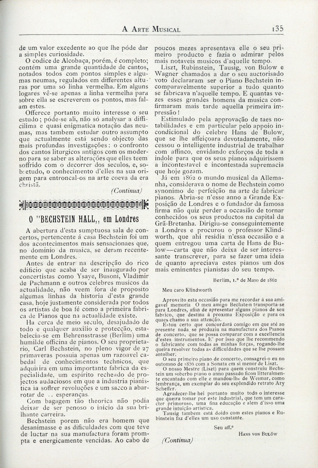 A arte musical : revista publicada quinzenalmente Ano 3, N.º 61, 15 de Julho de 1901 Adolphe Wouters A Música na Bibliotheca Nacional de Lisboa O "Bechstein Hall" em Londres Colyseu dos Recreios, por Esteves Lisboa ; Notas vagas : Cartas a uma Senhora, por Affonso Vargas Galeria dos nossos : D. Luiz da Cunha e Menezes, por Schaunard ; Invenções : Clarinette transpositor ; Conservatório de Moscow Noticiário Necrologia | Ano 3, N.º 61, 15 de Julho de 1901 > O "Bechstein Hall" em Londres > 0135 |