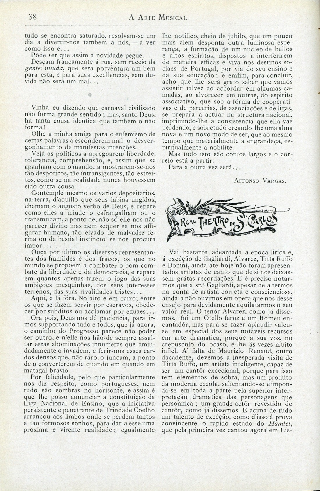 A arte musical : revista publicada quinzenalmente Ano 9, N.º 195, 15 de Fevereiro de 1907 capa verso publicidade publicidade Um exemplo a seguir, por Arthur Nogueira Notas vagas : cartas a uma Senhora, por Affonso Vargas Concertos Necrologia publicidade publicidade verso contracapa | Ano 9, N.º 195, 15 de Fevereiro de 1907 > Real Theatro de S. Carlos, por Esteves Lisboa > 0038 |