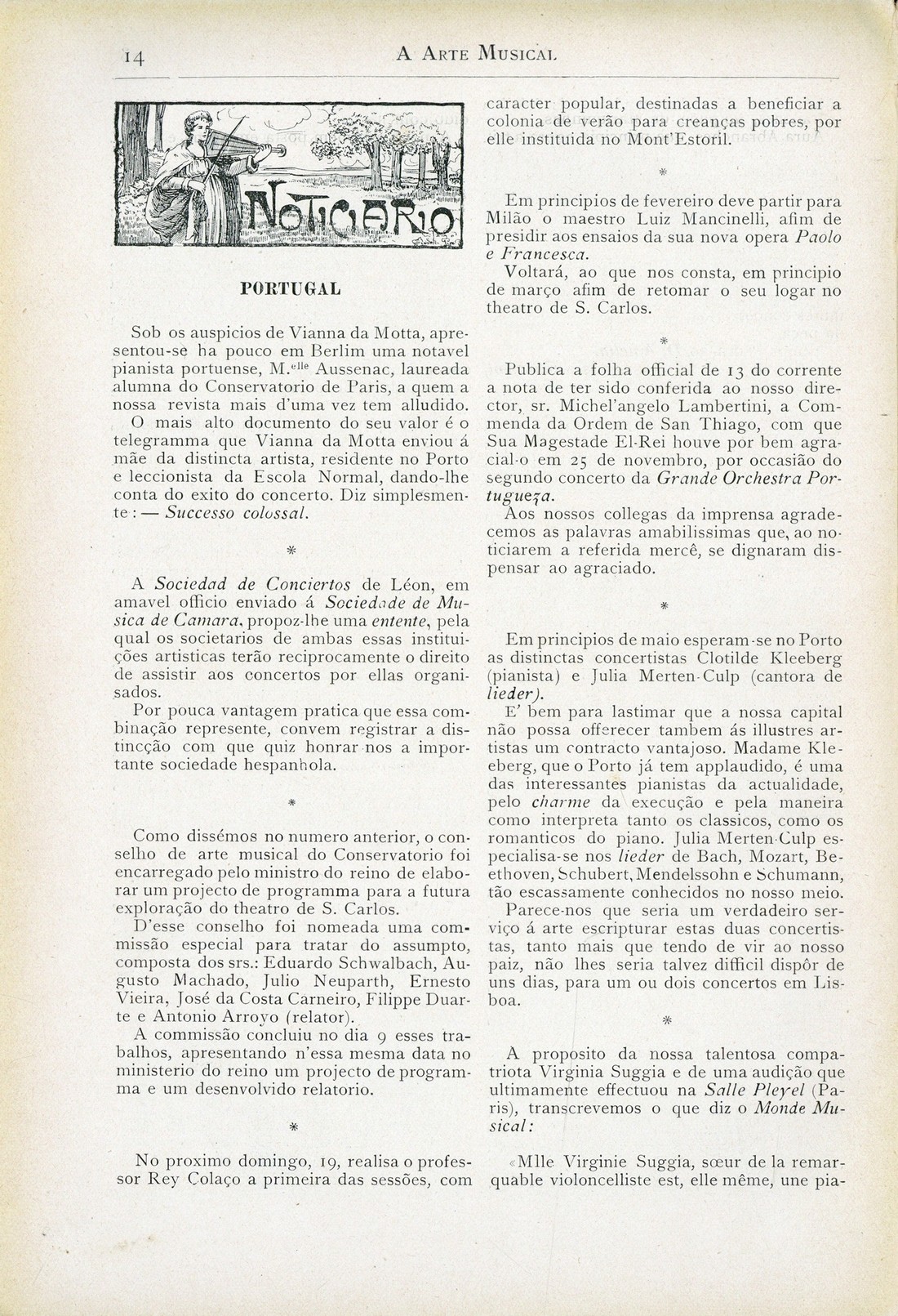 A arte musical : revista publicada quinzenalmente Ano 10, N.º 218, 15 de Janeiro de 1908 capa verso Van Ostrade (1610-1685) : Le violon hollandais, por Guido O Jubileu de Francisco Andrade Joseph Joachim (cont.), por Carlos de Mello Uma excursão a Bayreuth Concertos Necrologia verso contracapa | Ano 10, N.º 218, 15 de Janeiro de 1908 > Noticiário > 0014 |